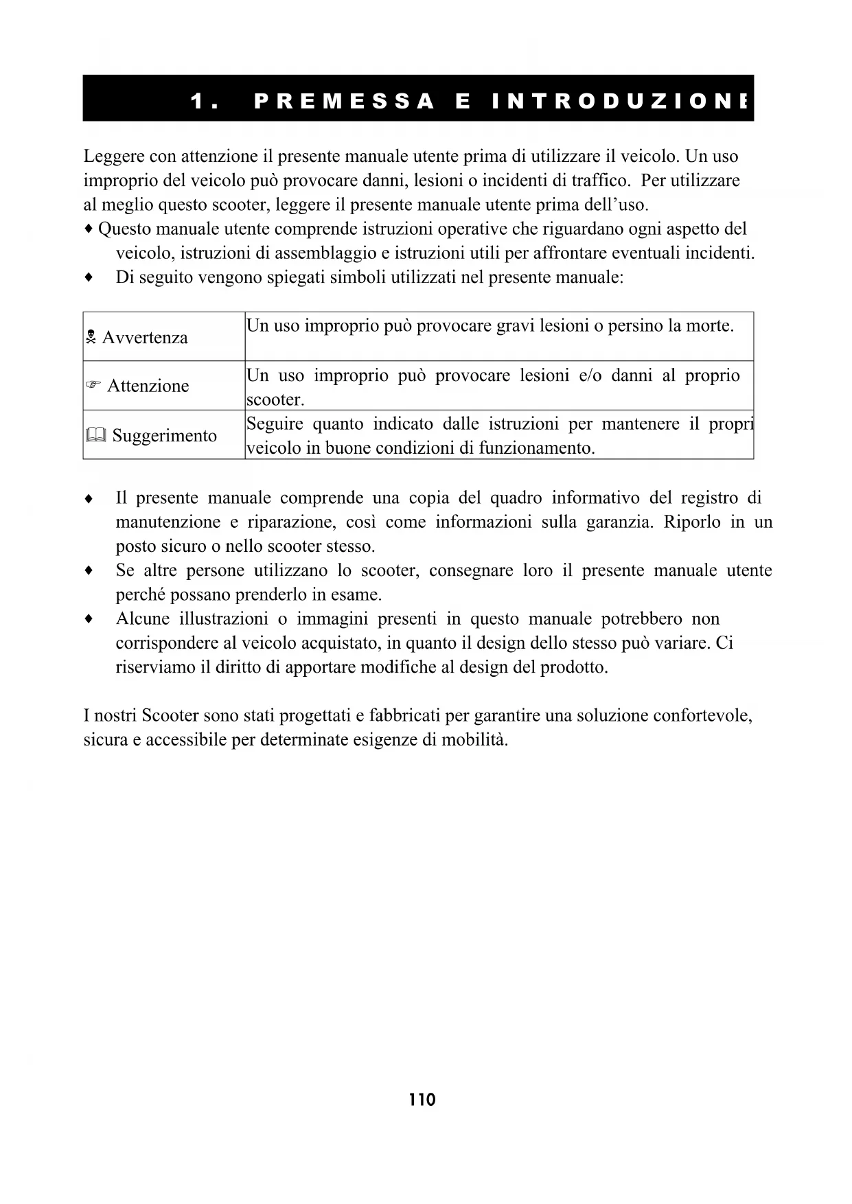 Leggere con attenzione il presente manuale utente prima di utilizzare il veicolo. Un uso improprio del veicolo può provocare danni, lesioni o incidenti di traffico. Per utilizzare al meglio questo scooter, leggere il presente manuale utente prima dell’uso.