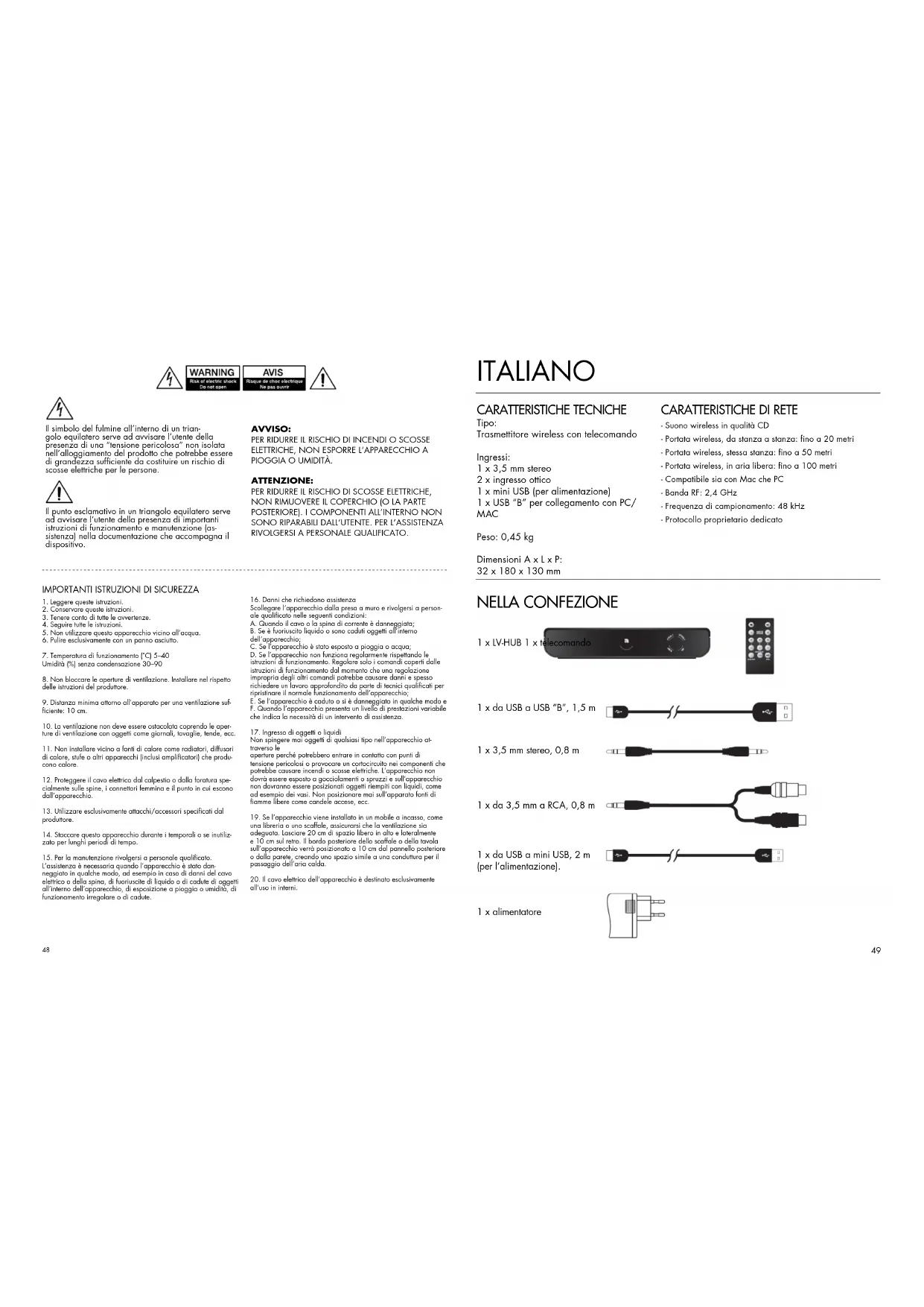 - Suono wireless in qualità CD- Portata wireless, da stanza a stanza: fino a 20 metri- Portata wireless, stessa stanza: fino a 50 metri- Portata wireless, in aria libera: fino a 100 metri- Compatibile sia con Mac che PC- Banda RF: 2,4 GHz- Frequenza di campionamento: 48 kHz- Protocollo proprietario dedicato 1 x LV-HUB 1 x telecomando 1 x alimentatore 1 x da USB a USB “B”, 1,5 m 1 x da USB a mini USB, 2 m (per l’alimentazione). 1 x 3,5 mm stereo, 0,8 m 1 x da 3,5 mm a RCA, 0,8 m50