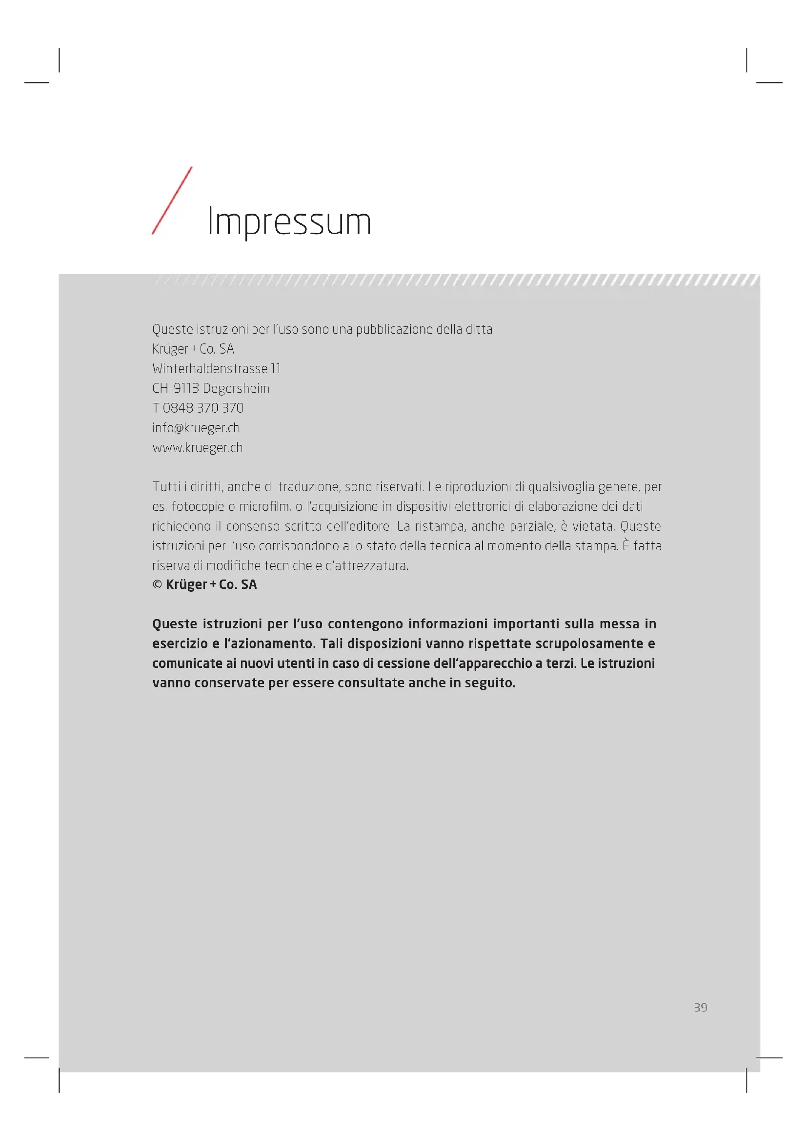 Gentile cliente, egregio cliente Congratulazioni per l’acquisto del nostro prodotto. Prima della messa in esercizio leggete attentamente tutte le informazioni contenute in queste istruzioni per l’uso e osservate con particolare attenzione le avvertenze di sicurezza. Questo apparecchio è collaudato DCE e adempie i requisiti delle vigenti direttive europee e nazionali. La conformità CE è stata comprovata e le relative dichiarazioni sono depositate presso il fabbricante. In caso di domande vogliate rivolgervi alla nostra consulenza tecnica: telefono 0848 370 370 o +41 91 735 15 85 fax +41 91 735 15 86 giubiasco@krueger.ch www.krueger.ch43