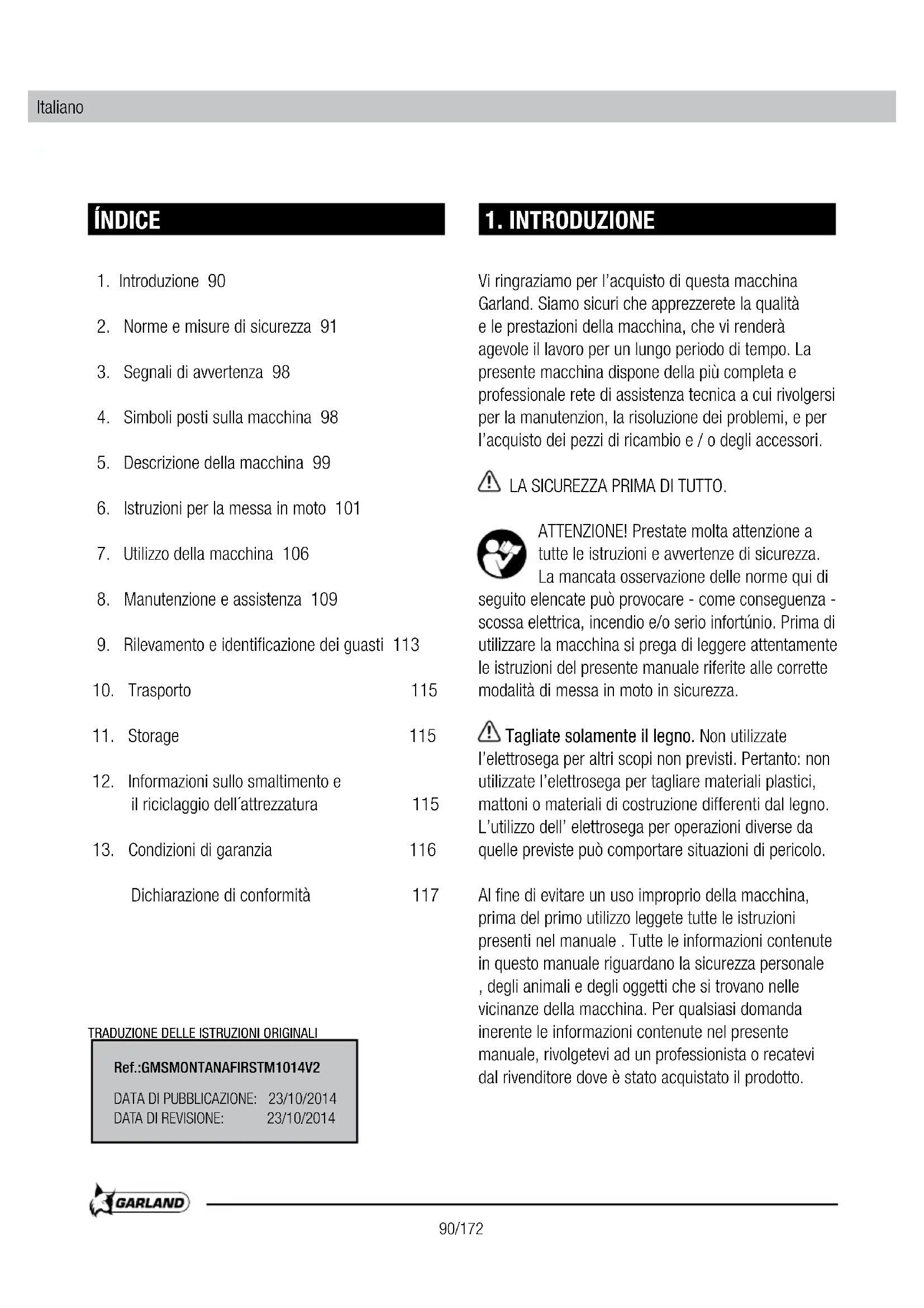 Vi ringraziamo per l'acquisto di questa macchina Garland. Siamo sicuri che apprezzerete la qualità e le prestazioni della macchina, che vi renderà agevole il lavoro per un lungo periodo di tempo. La presente macchina dispone della più Completa e professionale rete di assistenza tecnica a cui rivolgersi per la manutenzion, la risoluzione dei problemi, e per l'acquisto dei pezzi di ricambio e / o degli accessori.