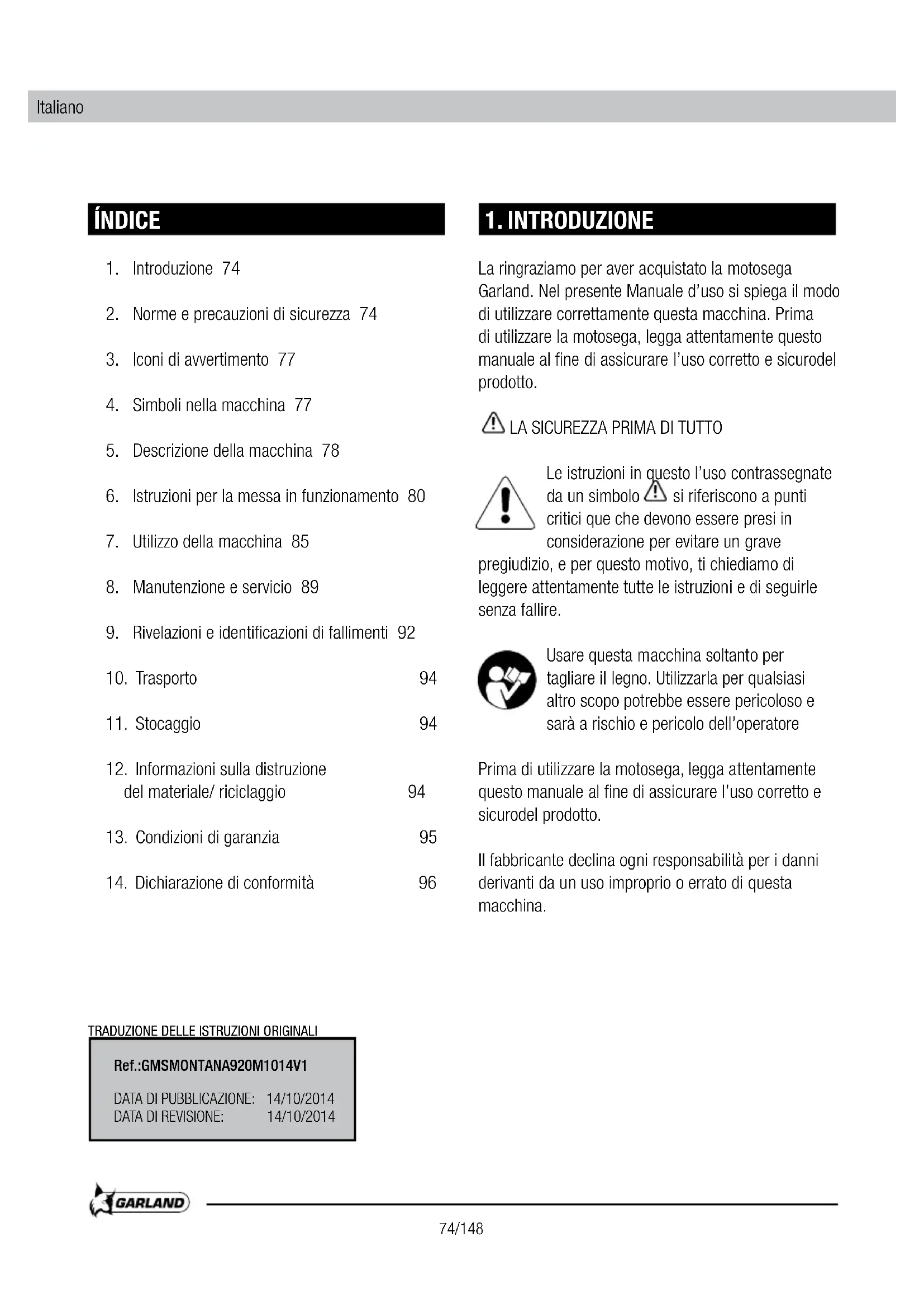 La ringraziamo per aver acquistato la motosega Garland. Nel presente Manuale d'uso si spiega il modo di utilizzato correttamente但这a macchina. Prima di utilizzare la motosega, legga attendamente quello manuale al fine di assicurare l'uso corretto e sicurodel prodotto.