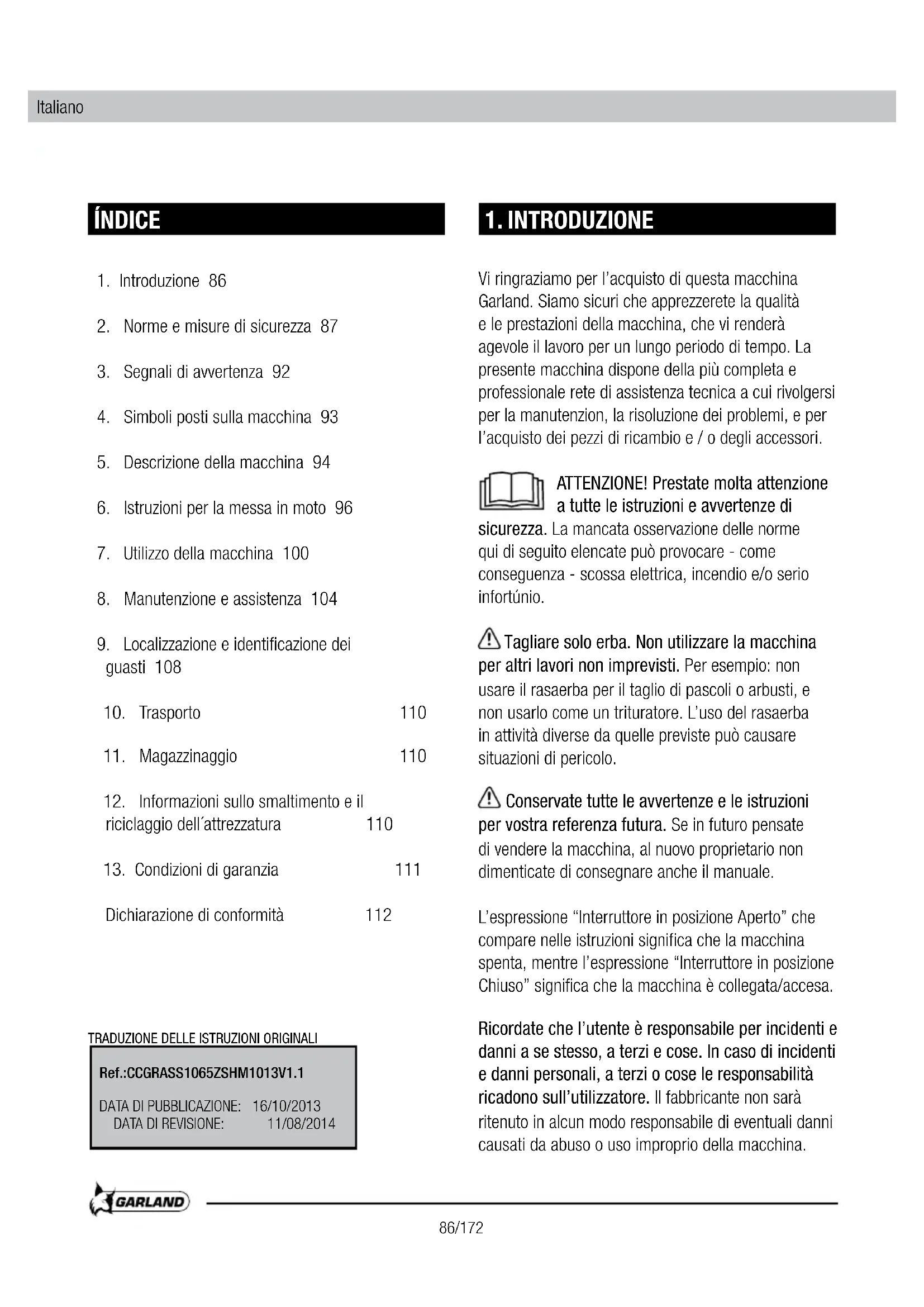 Vi ringraziamo per l'acquisto di questa macchina Garland. Siamo sicuri che apprezzerete la qualità e le prestazioni della macchina, che vi renderà agevole il lavoro per un lungo periodo di tempo. La presente macchina dispone della più Completa e professionale rete di assistenza tecnica a cui rivolgersi per la manutenzion, la risoluzione dei problemi, e per l'acquisto dei pezzi di ricambio e / o degli accessori.