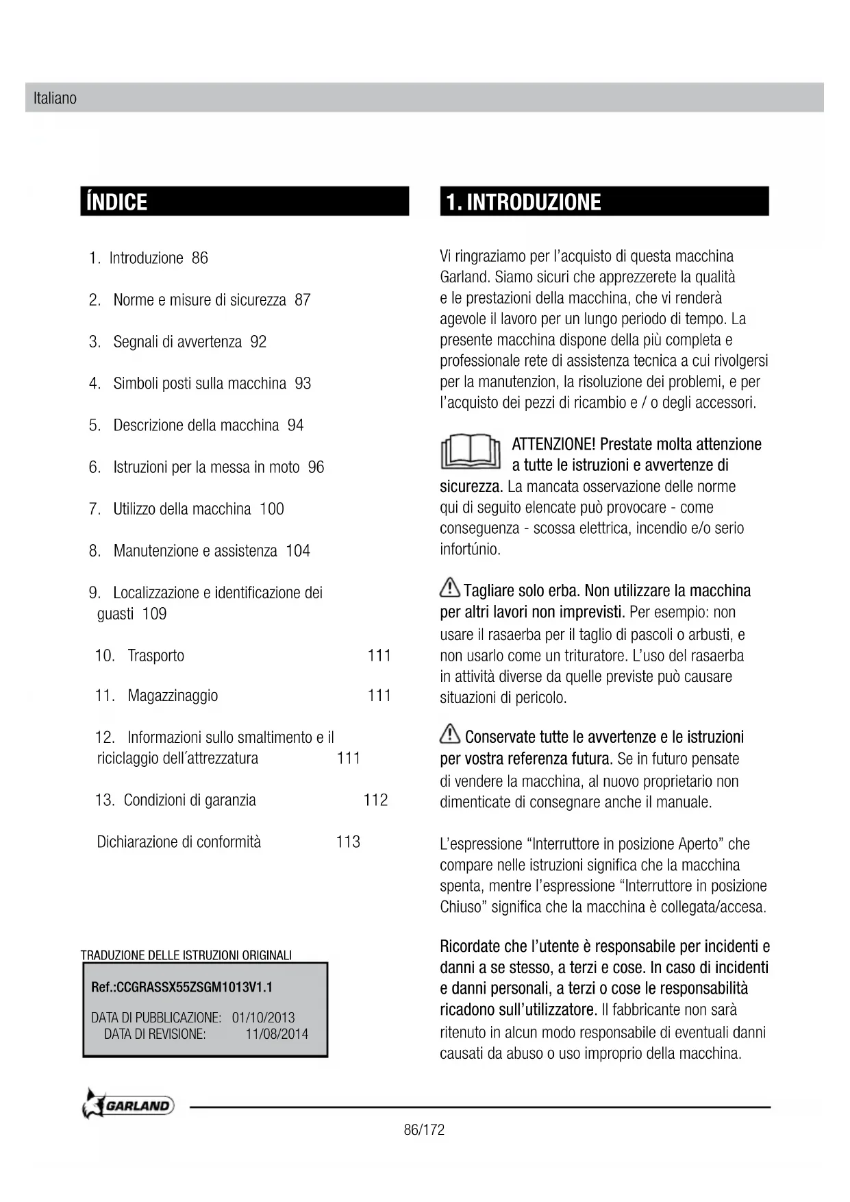 Vi ringraziamo per l'acquisto di questa macchina Garland. Siamo sicuri che apprezzerete la qualità e le prestazioni della macchina, che vi renderà agevole il lavoro per un lungo periodo di tempo. La presente macchina dispone della più Completa e professionale rete di assistenza tecnica a cui rivolgersi per la manutenzion, la risoluzione dei problemi, e per l'acquisto dei pezzi di ricambio e / o degli accessori.