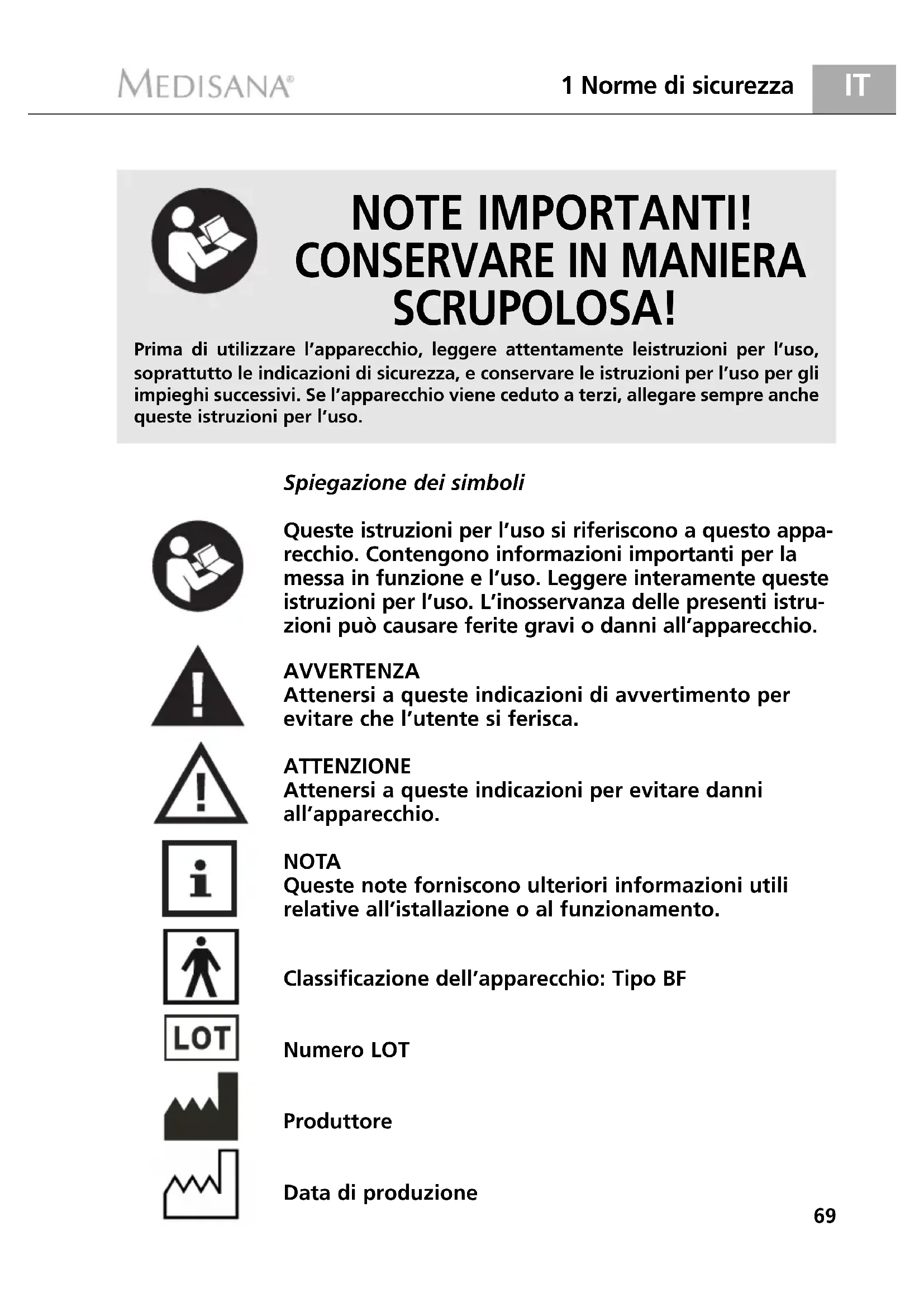 SCRUPOLOSA! Spiegazione dei simboli Queste istruzioni per l’uso si riferiscono a questo appa- recchio. Contengono informazioni importanti per la messa in funzione e l’uso. Leggere interamente queste istruzioni per l’uso. L’inosservanza delle presenti istru- zioni può causare ferite gravi o danni all’apparecchio. AVVERTENZA Attenersi a queste indicazioni di avvertimento per evitare che l’utente si ferisca. ATTENZIONE Attenersi a queste indicazioni per evitare danni all’apparecchio. NOTA Queste note forniscono ulteriori informazioni utili relative all’istallazione o al funzionamento. Classificazione dell’apparecchio: Tipo BF Numero LOT Produttore Data di produzione Prima di utilizzare l’apparecchio, leggere attentamente leistruzioni per l’uso,soprattutto le indicazioni di sicurezza, e conservare le istruzioni per l’uso per gliimpieghi successivi. Se l’apparecchio viene ceduto a terzi, allegare sempre anchequeste istruzioni per l’uso.