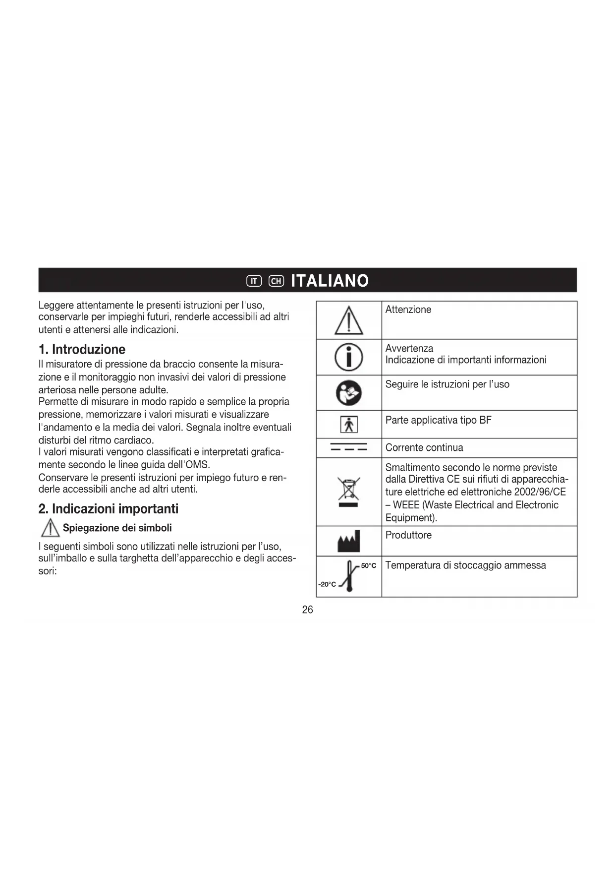 Il misuratore di pressione da braccio consente la misura- zione e il monitoraggio non invasivi dei valori di pressione arteriosa nelle persone adulte. Permette di misurare in modo rapido e semplice la propria pressione, memorizzare i valori misurati e visualizzare l'andamento e la media dei valori. Segnala inoltre eventuali disturbi del ritmo cardiaco. I valori misurati vengono classificati e interpretati grafica- mente secondo le linee guida dell'OMS. Conservare le presenti istruzioni per impiego futuro e ren- derle accessibili anche ad altri utenti.