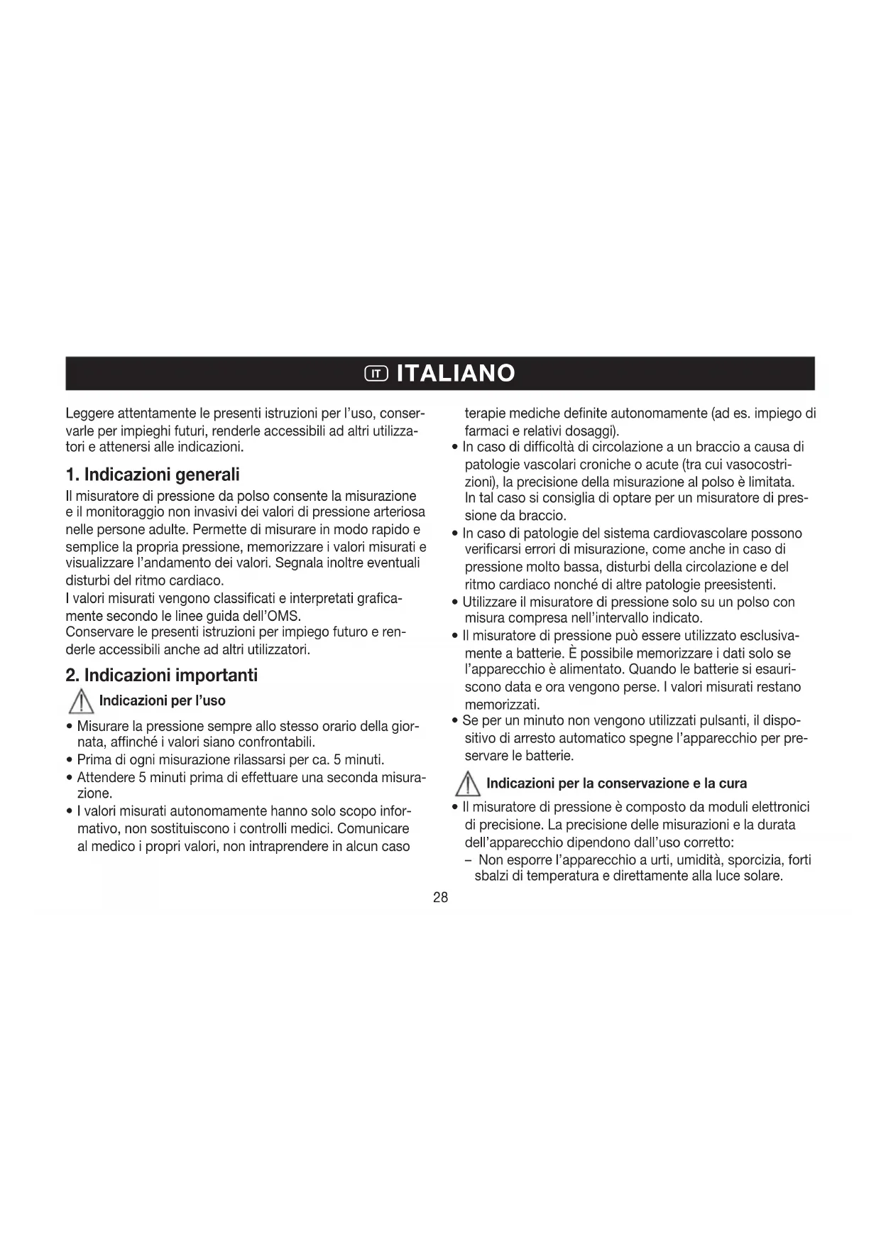 Il misuratore di pressione è composto da moduli elettronici di precisione. La precisione delle misurazioni e la durata dell’apparecchio dipendono dall’uso corretto: – Non esporre l’apparecchio a urti, umidità, sporcizia, forti sbalzi di temperatura e direttamente alla luce solare. I ITALIANO29 – Non far cadere l’apparecchio. – Non utilizzare l’apparecchio in prossimità di forti campi elettromagnetici, tenerlo lontano da impianti radio o tele- foni cellulari.