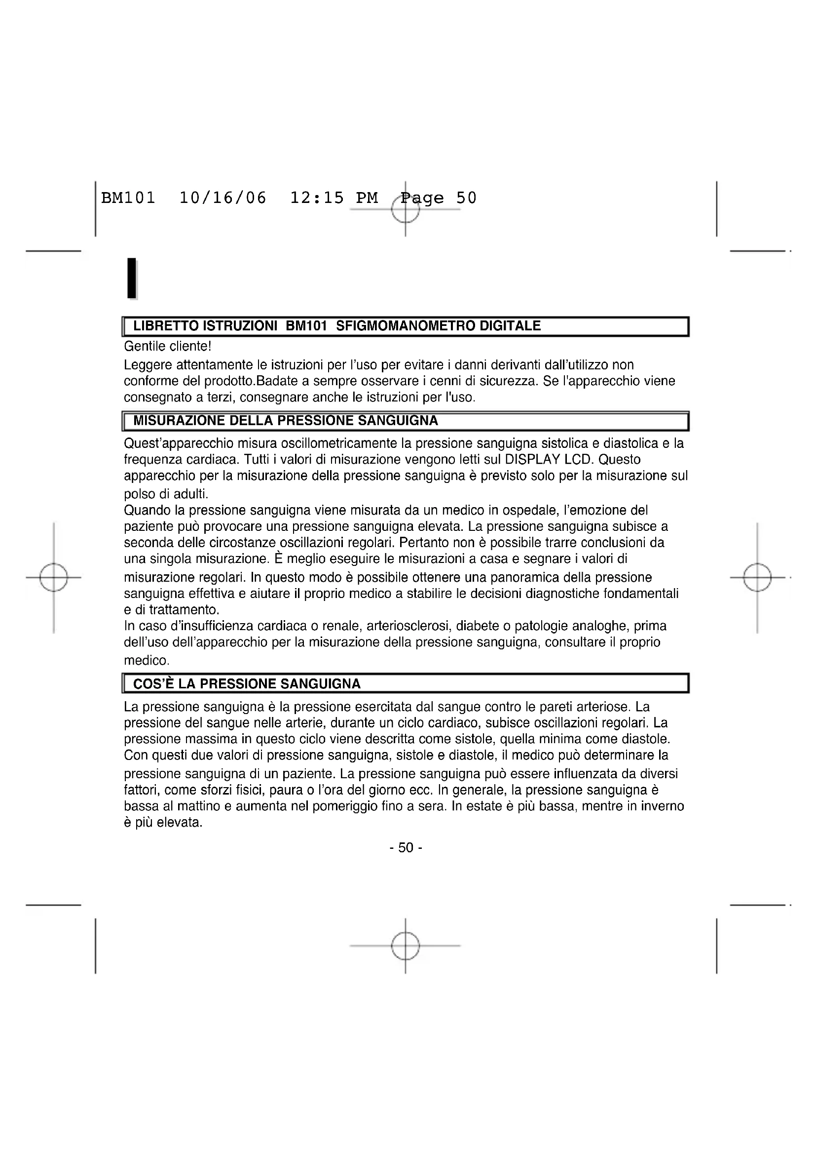 La pressione sanguigna è la pressione esercitata dal sangue contro le pareti arteriose. La pressione del sangue nelle arterie, durante un ciclo cardiaco, subisce oscillazioni regolari. La pressione massima in questo ciclo viene descritta come sistole, quella minima come diastole. Con questi due valori di pressione sanguigna, sistole e diastole, il medico può determinare la pressione sanguigna di un paziente. La pressione sanguigna può essere influenzata da diversi fattori, come sforzi fisici, paura o l’ora del giorno ecc. In generale, la pressione sanguigna è bassa al mattino e aumenta nel pomeriggio fino a sera. In estate è più bassa, mentre in inverno è più elevata. BM101 10/16/06 12:15 PM Page 50- 51 -