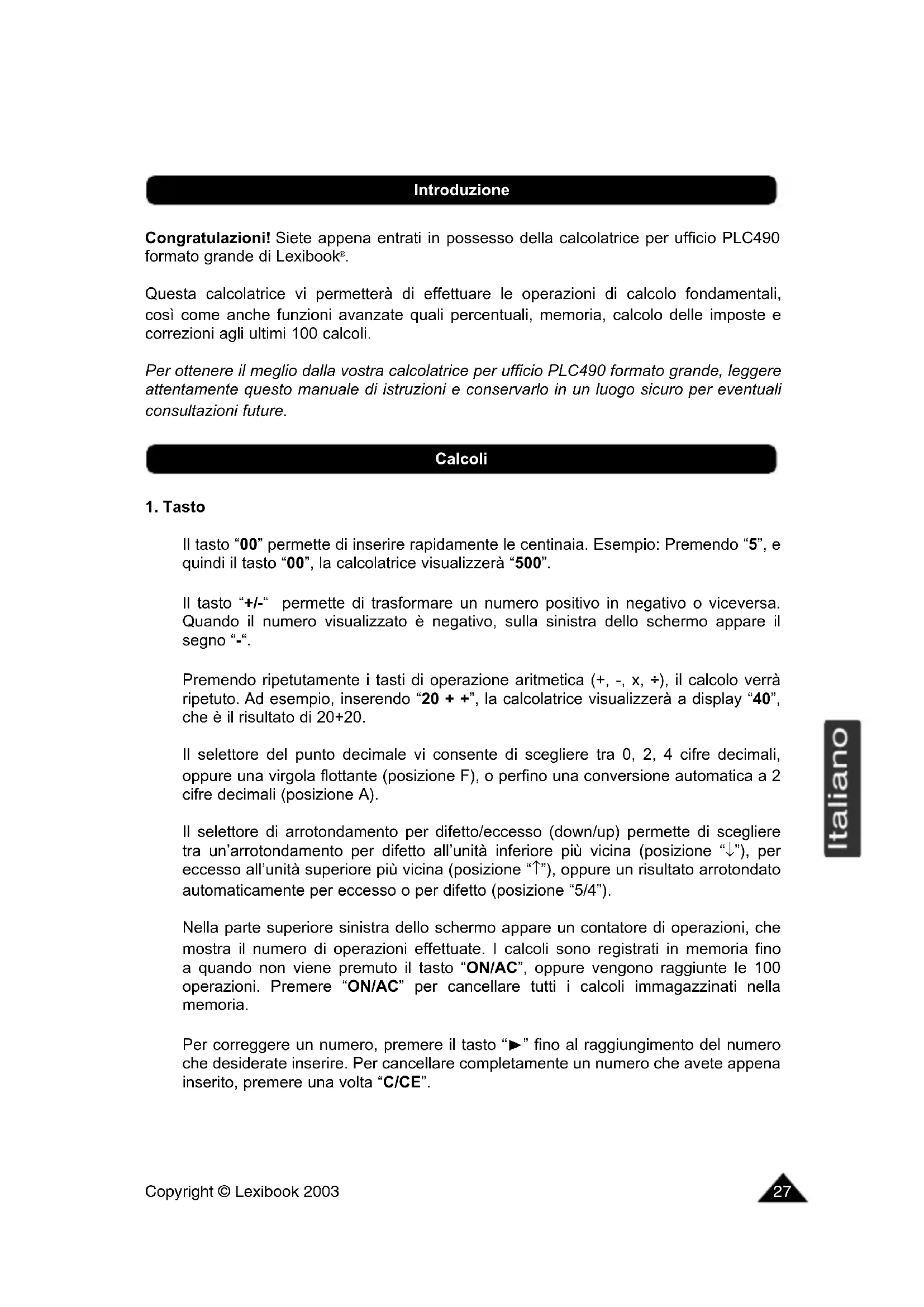 Il tasto “00” permette di inserire rapidamente le centinaia. Esempio: Premendo “5”, e quindi il tasto “00”, la calcolatrice visualizzerà “500”. Il tasto “+/-“ permette di trasformare un numero positivo in negativo o viceversa. Quando il numero visualizzato è negativo, sulla sinistra dello schermo appare il segno “-“. Premendo ripetutamente i tasti di operazione aritmetica (+, -, x, ÷), il calcolo verrà ripetuto. Ad esempio, inserendo “20 + +”, la calcolatrice visualizzerà a display “40”, che è il risultato di 20+20. Il selettore del punto decimale vi consente di scegliere tra 0, 2, 4 cifre decimali, oppure una virgola flottante (posizione F), o perfino una conversione automatica a 2 cifre decimali (posizione A). Il selettore di arrotondamento per difetto/eccesso (down/up) permette di scegliere tra un’arrotondamento per difetto all’unità inferiore più vicina (posizione “↓”), per eccesso all’unità superiore più vicina (posizione “↑”), oppure un risultato arrotondato automaticamente per eccesso o per difetto (posizione “5/4”). Nella parte superiore sinistra dello schermo appare un contatore di operazioni, che mostra il numero di operazioni effettuate. I calcoli sono registrati in memoria fino a quando non viene premuto il tasto “ON/AC”, oppure vengono raggiunte le 100 operazioni. Premere “ON/AC” per cancellare tutti i calcoli immagazzinati nella memoria. Per correggere un numero, premere il tasto “” fino al raggiungimento del numero che desiderate inserire. Per cancellare completamente un numero che avete appena inserito, premere una volta “C/CE”. Calcoli IntroduzioneCopyright © Lexibook 2003