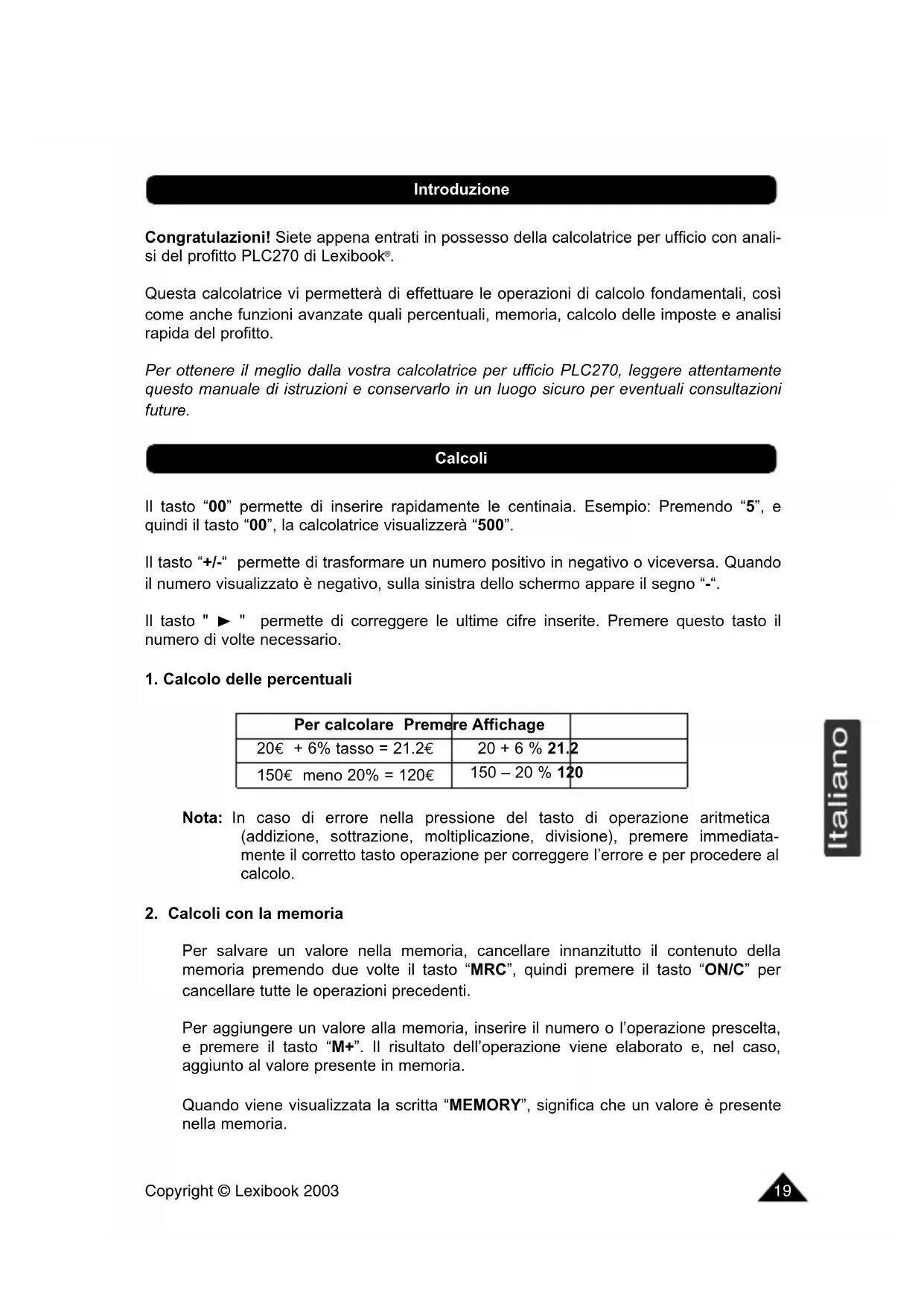Per salvare un valore nella memoria, cancellare innanzitutto il contenuto della memoria premendo due volte il tasto “MRC”, quindi premere il tasto “ON/C” per cancellare tutte le operazioni precedenti. Per aggiungere un valore alla memoria, inserire il numero o l’operazione prescelta, e premere il tasto “M+”. Il risultato dell’operazione viene elaborato e, nel caso, aggiunto al valore presente in memoria. Quando viene visualizzata la scritta “MEMORY”, significa che un valore è presente nella memoria. Per calcolare Premere Affichage 20€ + 6% tasso = 21.2€ 20 + 6 % 21.2 150€ meno 20% = 120€ 150 – 20 % 120 Calcoli IntroduzioneCopyright © Lexibook 2003
