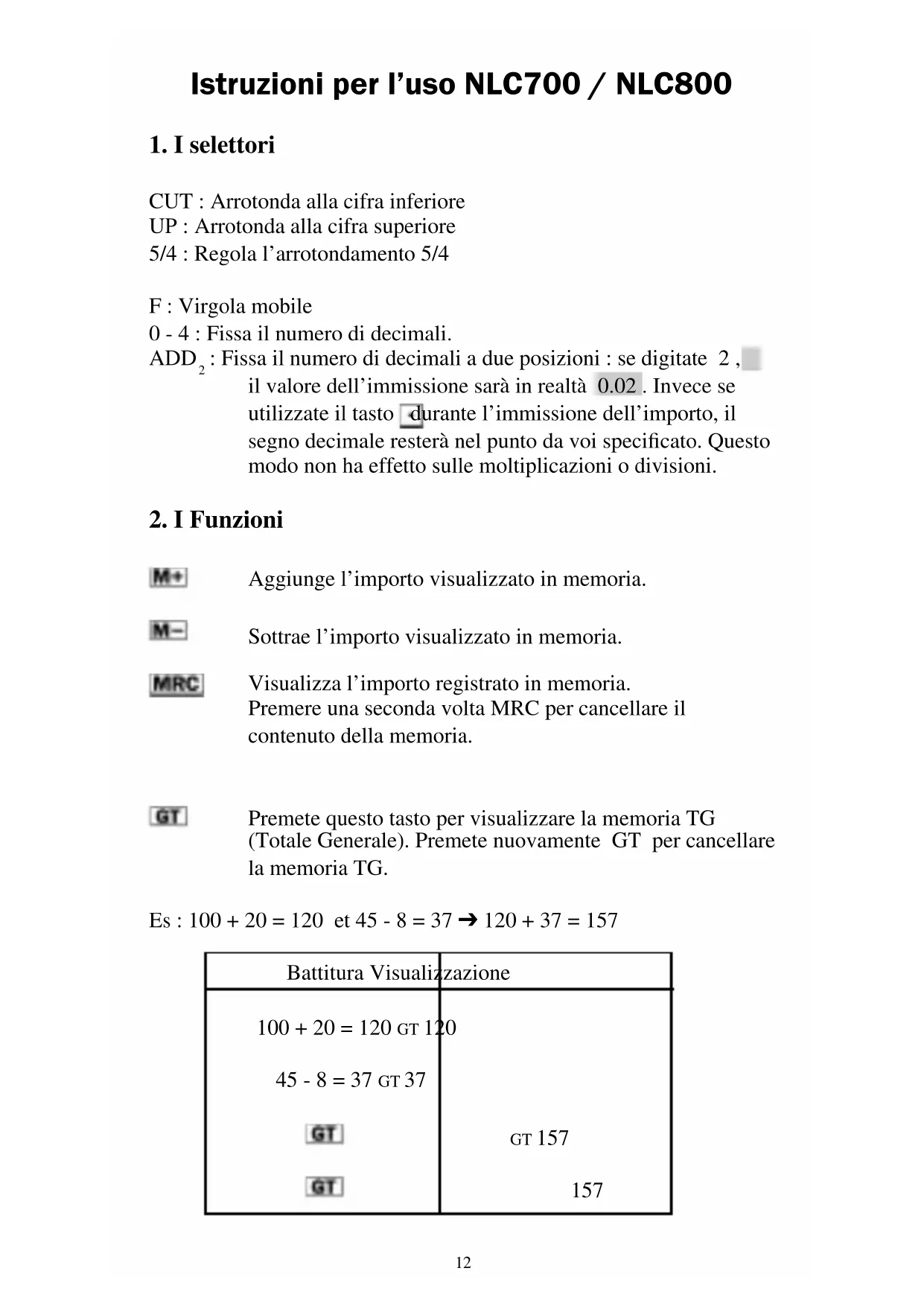 Aggiunge l’importo visualizzato in memoria. Sottrae l’importo visualizzato in memoria. Visualizza l’importo registrato in memoria. Premere una seconda volta MRC per cancellare il contenuto della memoria. Premete questo tasto per visualizzare la memoria TG (Totale Generale). Premete nuovamente GT per cancellare la memoria TG. Es : 100 + 20 = 120 et 45 - 8 = 37 ➔ 120 + 37 = 157 Battitura Visualizzazione 100 + 20 = 120 GT 120