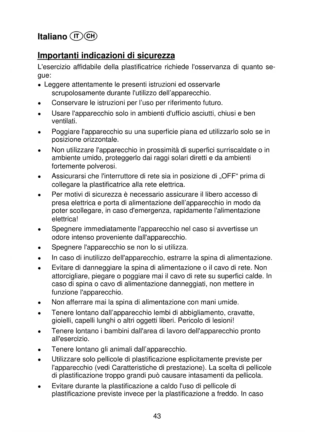 Importanti indicazioni di sicurezza L'esercizio affidabile della plastificatrice richiede l'osservanza di quanto se- gue: ● Leggere attentamente le presenti istruzioni ed osservarle scrupolosamente durante l'utilizzo dell’apparecchio. ● Conservare le istruzioni per l’uso per riferimento futuro. ● Usare l'apparecchio solo in ambienti d'ufficio asciutti, chiusi e ben ventilati. ● Poggiare l'apparecchio su una superficie piana ed utilizzarlo solo se in posizione orizzontale. ● Non utilizzare l'apparecchio in prossimità di superfici surriscaldate o in ambiente umido, proteggerlo dai raggi solari diretti e da ambienti fortemente polverosi. ● Assicurarsi che l'interruttore di rete sia in posizione di „OFF“ prima di collegare la plastificatrice alla rete elettrica. ● Per motivi di sicurezza è necessario assicurare il libero accesso di presa elettrica e porta di alimentazione dell’apparecchio in modo da poter scollegare, in caso d'emergenza, rapidamente l'alimentazione elettrica! ● Spegnere immediatamente l'apparecchio nel caso si avvertisse un odore intenso proveniente dall'apparecchio. ● Spegnere l'apparecchio se non lo si utilizza. ● In caso di inutilizzo dell'apparecchio, estrarre la spina di alimentazione. ● Evitare di danneggiare la spina di alimentazione o il cavo di rete. Non attorcigliare, piegare o poggiare mai il cavo di rete su superfici calde. In caso di spina o cavo di alimentazione danneggiati, non mettere in funzione l'apparecchio. ● Non afferrare mai la spina di alimentazione con mani umide. ● Tenere lontano dall’apparecchio lembi di abbigliamento, cravatte, gioielli, capelli lunghi o altri oggetti liberi. Pericolo di lesioni! ● Tenere lontano i bambini dall'area di lavoro dell'apparecchio pronto all'esercizio. ● Tenere lontano gli animali dall’apparecchio. ● Utilizzare solo pellicole di plastificazione esplicitamente previste per l'apparecchio (vedi Caratteristiche di prestazione). La scelta di pellicole di plastificazione troppo grandi può causare intasamenti da pellicola. ● Evitare durante la plastificazione a caldo l'uso di pellicole di plastificazione previste invece per la plastificazione a freddo. In caso44 contrario l'apparecchio, la pellicola di plastificazione ed il documento saranno danneggiati. ● Non tagliare le pellicole di plastificazione nel tentativo di adattarne le dimensioni. Gli spigoli di taglio risultanti possono infatti causare un