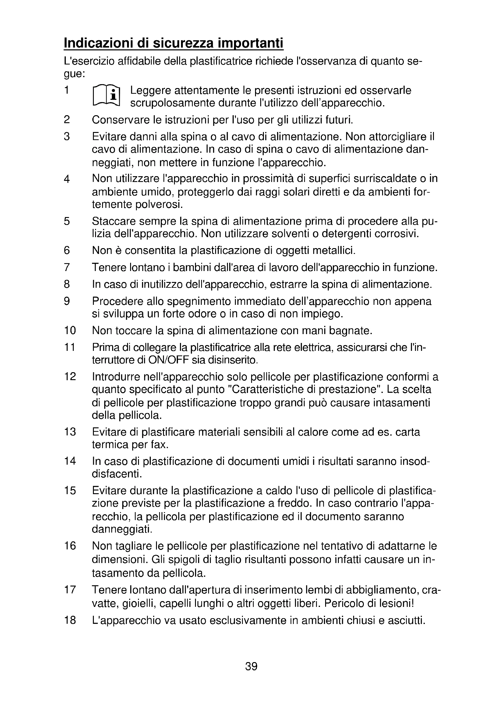 Non tagliare le pellicole per plastificazione nel tentativo di adattarne le dimensioni. Gli spigoli di taglio risultanti possono infatti causare un in- tasamento da pellicola. 17 Tenere lontano dall'apertura di inserimento lembi di abbigliamento, cra- vatte, gioielli, capelli lunghi o altri oggetti liberi. Pericolo di lesioni!