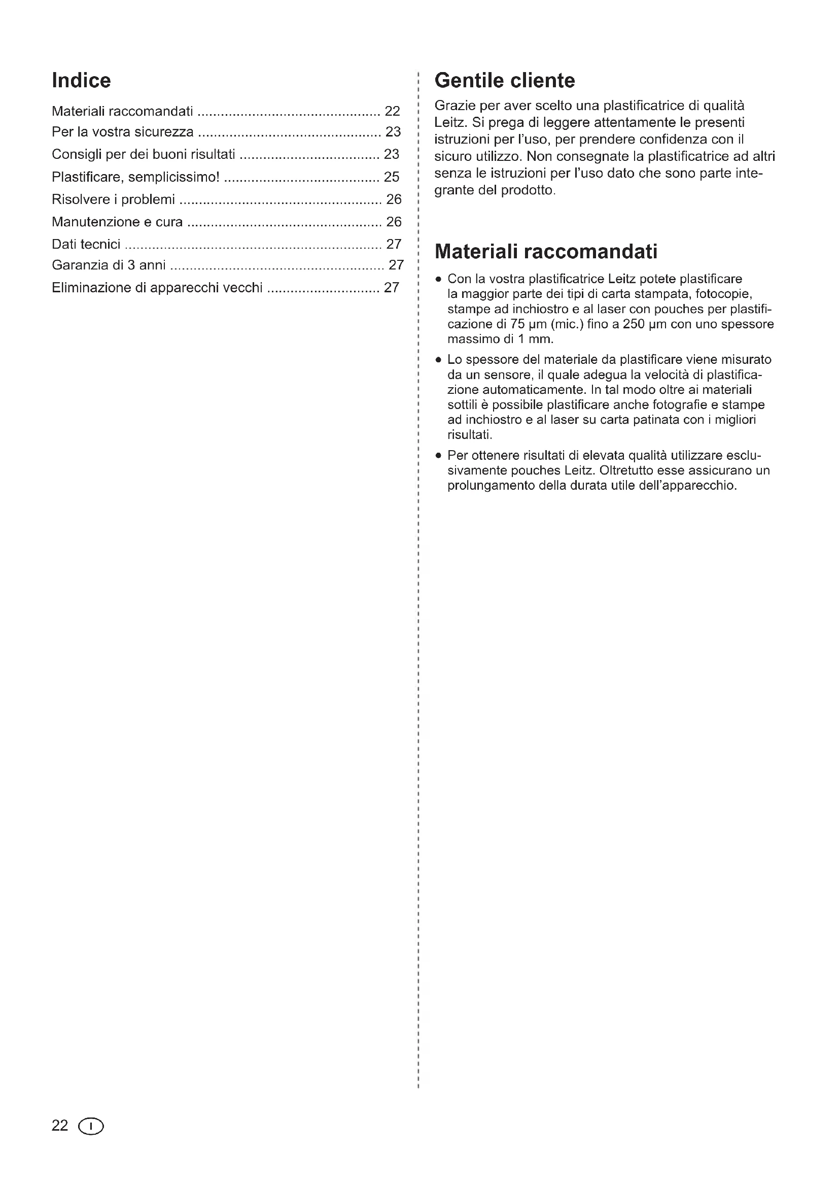 - Con la vostra plasticatrice Leitz potete plasticare la maggior parte dei tipi di carta stampata, fotocopie, stampe ad inchiostro e al laser con pouches per plasti-cazione di 75 µm (mic.) no a 250 µm con uno spessore massimo di 1 mm. Lo spessore del materiale da plasticare viene misurato da un sensore, il quale adegua la velocità di plastica-zione automaticamente. In tal modo oltre ai materiali sottili è possibile plasticare anche fotograe e stampe ad inchiostro e al laser su carta patinata con i migliori risultati. Per ottenere risultati di elevata qualità utilizzare esclu-sivamente pouches Leitz. Oltretutto esse assicurano un prolungamento della durata utile dell’apparecchio. Indice Materiali raccomandati p. 22