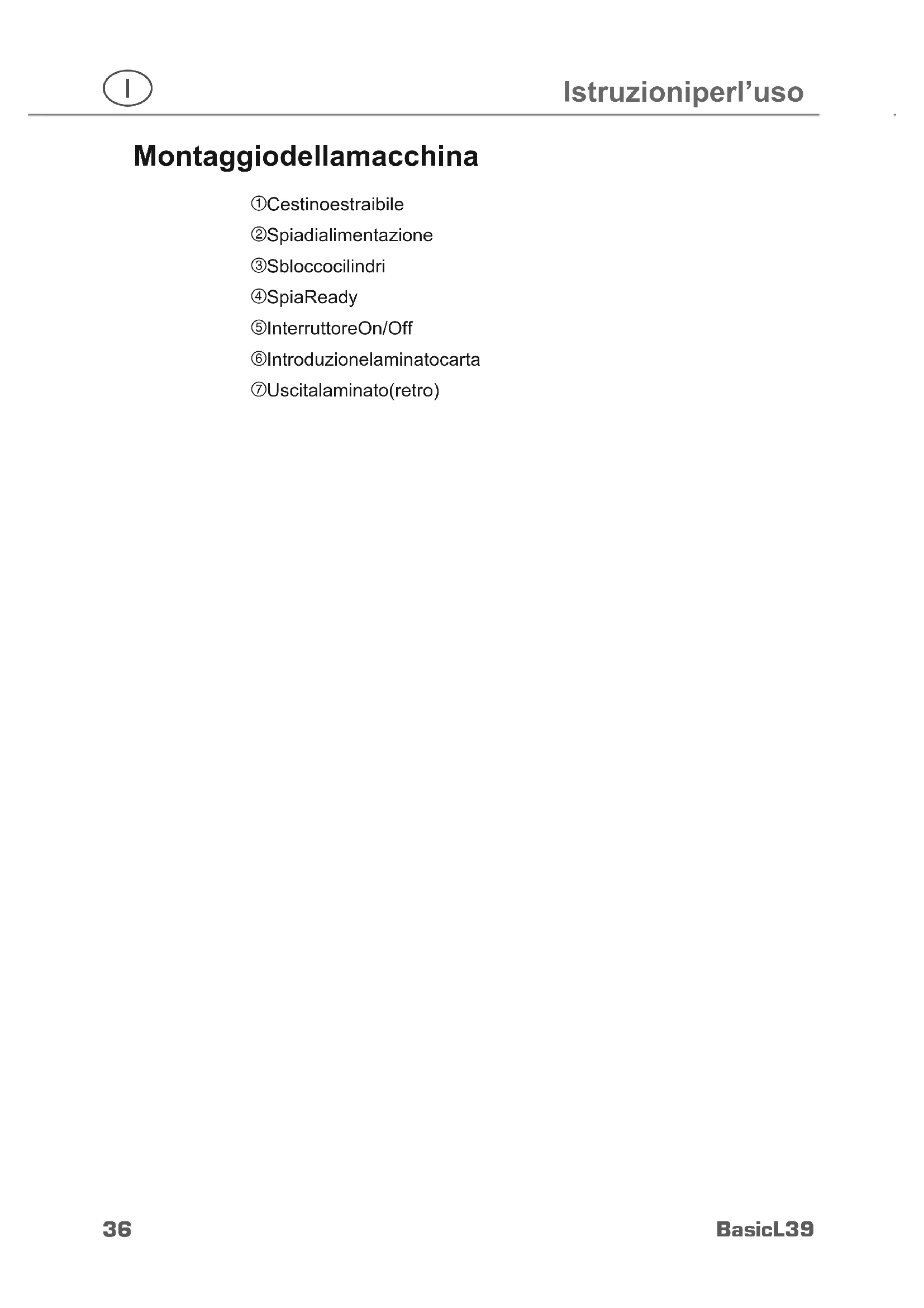 Istruzioni per l’uso Montaggio della macchina 1 Cestino estraibile 2 Spia di alimentazione 3 Sblocco cilindri 4 Spia Ready 5 Interruttore On/Off 6 Introduzione laminato carta 7 Uscita laminato (retro)37 Basic L39