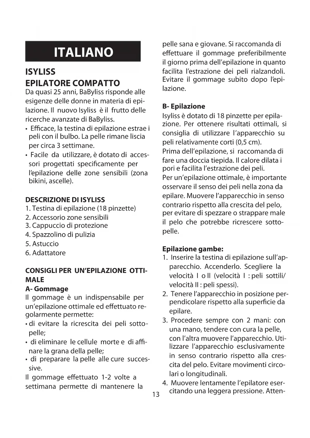 - Gebruik de terugname- en ophalings- systemen die u ter beschikking staan. Sommige materialen kunnen aldus worden gerecycleerd of worden benut.13 ITALIANO ISYLISS EPILATORE COMPATTO Da quasi 25 anni, BaByliss risponde alle esigenze delle donne in materia di epi- lazione. Il nuovo Isyliss è il frutto delle ricerche avanzate di BaByliss.