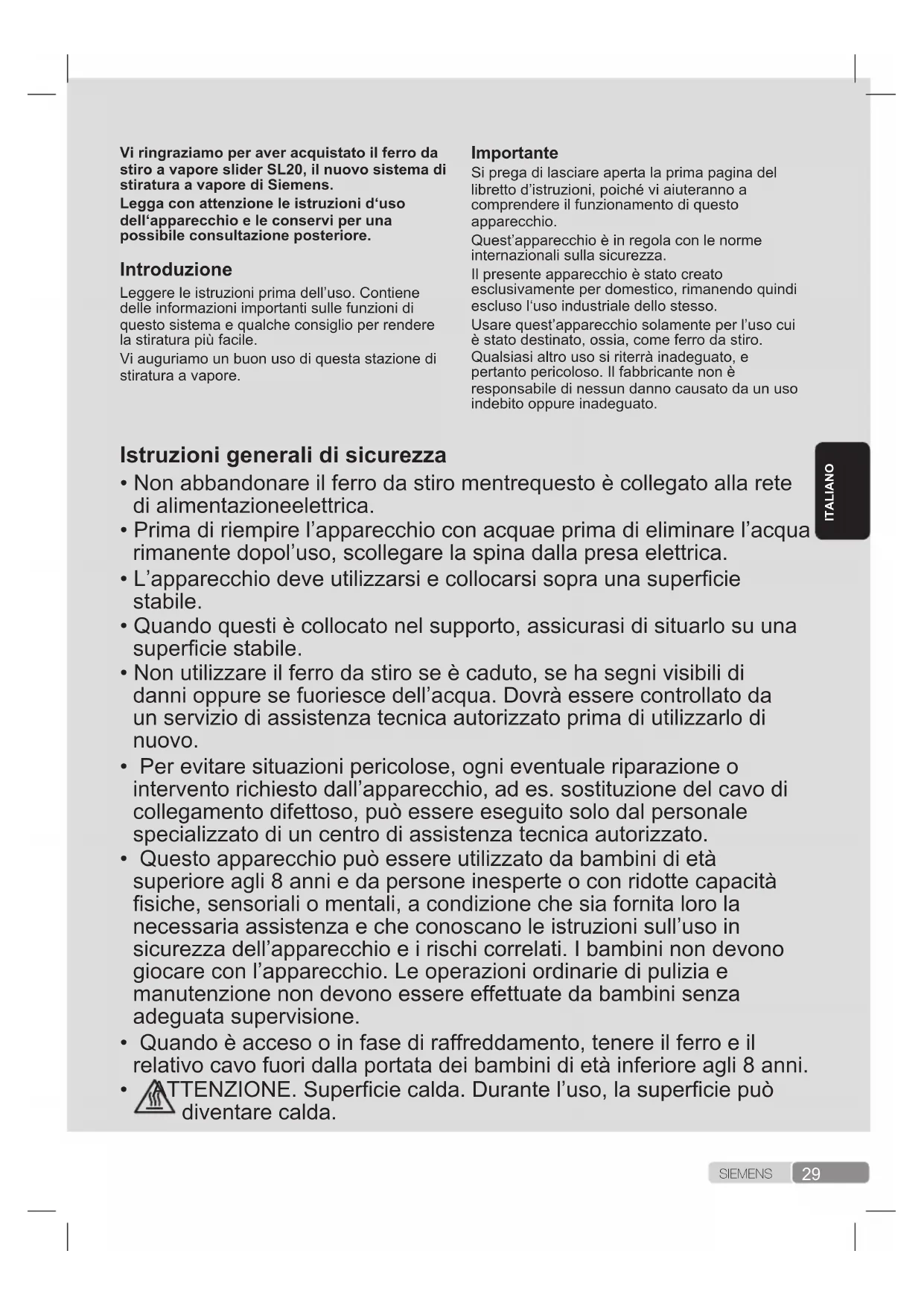 - Il suft d’appuyer une nouvelle fois sur le bouton de libération de vapeur et la vapeur s’arrêtera. Si les problèmes persistent après avoir appliqué les conseils précités, adressez-vous à un service d’assistance technique agré.29 S I E M E N SITALIANO Viringraziamoperaveracquistatoilferroda stiroavaporesliderSL20,ilnuovosistemadi stiraturaavaporediSiemens. Leggaconattenzioneleistruzionid‘uso dell‘apparecchioeleconserviperuna possibileconsultazioneposteriore. Introduzione Leggere le istruzioni prima dell’uso. Contiene delle informazioni importanti sulle funzioni di questo sistema e qualche consiglio per rendere la stiratura più facile. Vi auguriamo un buon uso di questa stazione di stiratura a vapore. Importante Si prega di lasciare aperta la prima pagina del libretto d’istruzioni, poiché vi aiuteranno a comprendere il funzionamento di questo apparecchio. Quest’apparecchio è in regola con le norme internazionali sulla sicurezza. Il presente apparecchio è stato creato esclusivamente per domestico, rimanendo quindi escluso l‘uso industriale dello stesso. Usare quest’apparecchio solamente per l’uso cui è stato destinato, ossia, come ferro da stiro. Qualsiasi altro uso si riterrà inadeguato, e pertanto pericoloso. Il fabbricante non è responsabile di nessun danno causato da un uso indebito oppure inadeguato. Istruzionigeneralidisicurezza