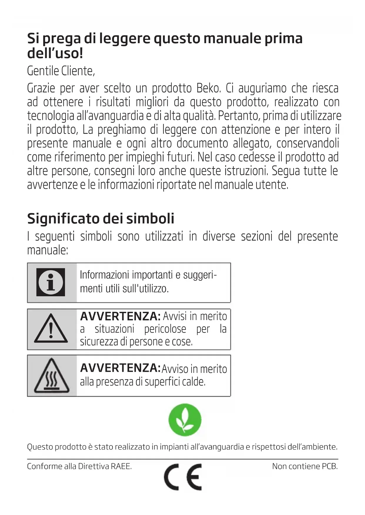 AVVERTENZA: Avvisi in merito a situazioni pericolose per la sicurezza di persone e cose. AVVERTENZA: Avviso in merito alla presenza di superfici calde. Non contiene PCB.Questo prodotto è stato realizzato in impianti all’avanguardia e rispettosi dell’ambiente.Conforme alla Direttiva RAEE.136 / IT Ferro a vapore/Manuale utente Questa sezione contiene istruzioni di sicurez- za che consentono di prevenire il pericolo di lesioni personali o di danni materiali. L’inosservanza di queste istruzioni invalida la garanzia accordata.