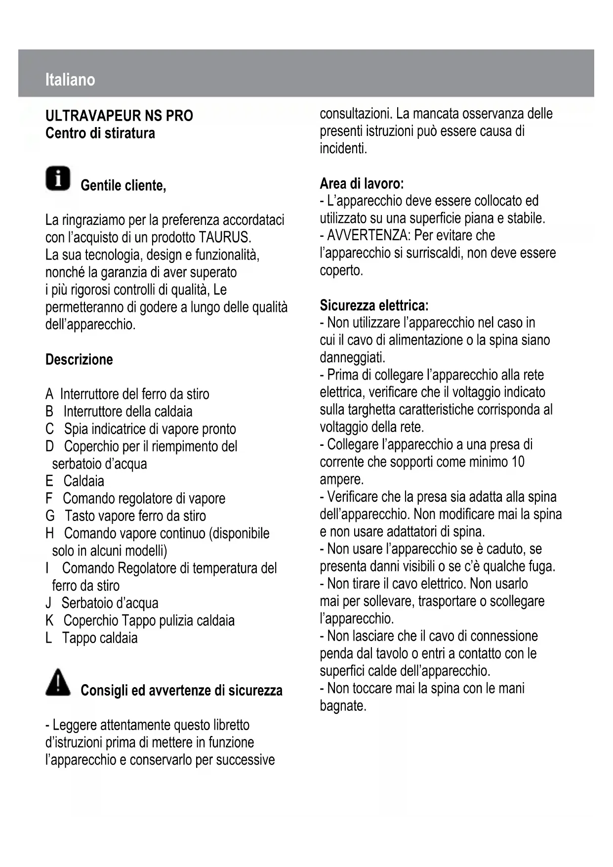 Centro di stiratura Gentile cliente, La ringraziamo per la preferenza accordataci con l’acquisto di un prodotto TAURUS. La sua tecnologia, design e funzionalità, nonché la garanzia di aver superato i più rigorosi controlli di qualità, Le permetteranno di godere a lungo delle qualità dell’apparecchio. Descrizione A Interruttore del ferro da stiro B Interruttore della caldaia C Spia indicatrice di vapore pronto D Coperchio per il riempimento del serbatoio d’acqua E Caldaia F Comando regolatore di vapore G Tasto vapore ferro da stiro H Comando vapore continuo (disponibile solo in alcuni modelli) I Comando Regolatore di temperatura del ferro da stiro J Serbatoio d’acqua K Coperchio Tappo pulizia caldaia L Tappo caldaia Consigli ed avvertenze di sicurezza - Leggere attentamente questo libretto d’istruzioni prima di mettere in funzione l’apparecchio e conservarlo per successive consultazioni. La mancata osservanza delle presenti istruzioni può essere causa di incidenti. Area di lavoro: - L’apparecchio deve essere collocato ed utilizzato su una supercie piana e stabile. - AVVERTENZA: Per evitare che l’apparecchio si surriscaldi, non deve essere coperto. Sicurezza elettrica: - Non utilizzare l’apparecchio nel caso in cui il cavo di alimentazione o la spina siano danneggiati. - Prima di collegare l’apparecchio alla rete elettrica, vericare che il voltaggio indicato sulla targhetta caratteristiche corrisponda al voltaggio della rete. - Collegare l’apparecchio a una presa di corrente che sopporti come minimo 10 ampere. - Vericare che la presa sia adatta alla spina dell’apparecchio. Non modicare mai la spina e non usare adattatori di spina. - Non usare l’apparecchio se è caduto, se presenta danni visibili o se c’è qualche fuga. - Non tirare il cavo elettrico. Non usarlo mai per sollevare, trasportare o scollegare l’apparecchio. - Non lasciare che il cavo di connessione penda dal tavolo o entri a contatto con le superci calde dell’apparecchio. - Non toccare mai la spina con le mani bagnate.Precauzioni d’uso: - Prima di ogni utilizzo, svolgere completamente il cavo dell’apparecchio. - Non utilizzare l’apparecchio se il suo dispositivo d’avvio/arresto non funziona. - Staccare la spina dalla presa di corrente quando l’apparecchio non è in uso e prima di compiere qualsiasi operazione di pulizia. - Questo apparecchio è destinato unicamente all’uso domestico, non professionale o industriale. - Questo apparecchio non è un giocattolo. Assicurarsi che i bambini non giochino con l’apparecchio. - Questo apparecchio è stato concepito per essere utilizzato esclusivamente da adulti. Non permettere che venga utilizzato da bambini o da persone che non ne conoscono il funzionamento. - Tenere fuori della portata di bambini e/o persone disabili. - Lasciare raffreddare l’apparecchio prima di riporlo. - Per un corretto funzionamento, mantenere la piastra liscia, non applicarla su oggetti metallici (per esempio sulla tavola da stiro, bottoni, cerniere ...) - Utilizzare l’apparecchio solo con acqua. - Si consiglia l’uso di acqua distillata, specialmente se l’acqua di cui si dispone contiene qualche tipo di residuo o è del tipo “dura” (che contiene calcio o magnesio). - Usare sempre l’apparecchio sotto sorveglianza. - Collocare il termostato nella posizione di minimo (MIN) non garantisce la sconnessione permanente dell’apparecchio. - Non utilizzare l’apparecchio su nessuna parte del corpo di persone o animali. - Il produttore invalida la garanzia e declina ogni responsabilità in caso di uso inappropriato dell’apparecchio o non conforme alle istruzioni d’uso.