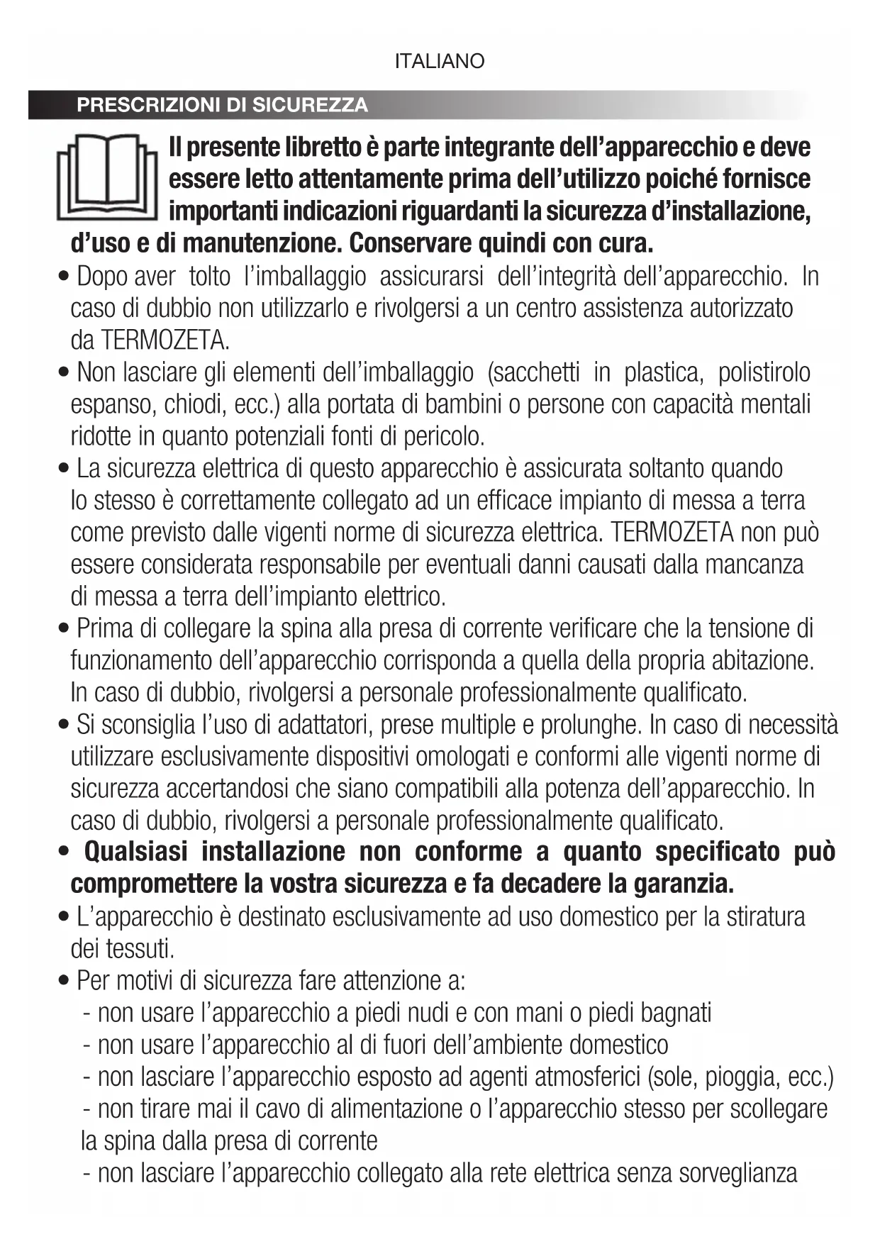 - La sicurezza elettrica di questo apparecchio è assicurata soltanto quando lo stesso è correttamente collegato ad un efcace impianto di messa a terra come previsto dalle vigenti norme di sicurezza elettrica. TERMOZETA non può essere considerata responsabile per eventuali danni causati dalla mancanza di messa a terra dell’impianto elettrico.