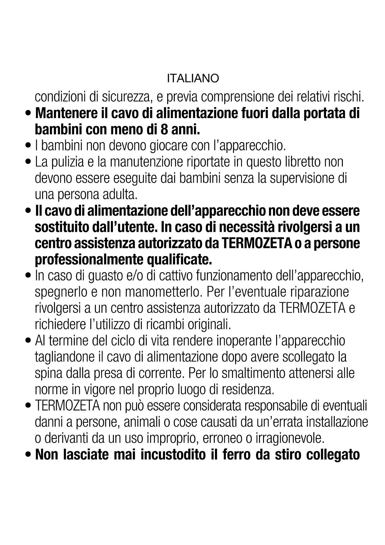 - Il cavo di alimentazione dell’apparecchio non deve essere sostituito dall’utente. In caso di necessità rivolgersi a un centro assistenza autorizzato da TERMOZETA o a persone professionalmentequalicate.
