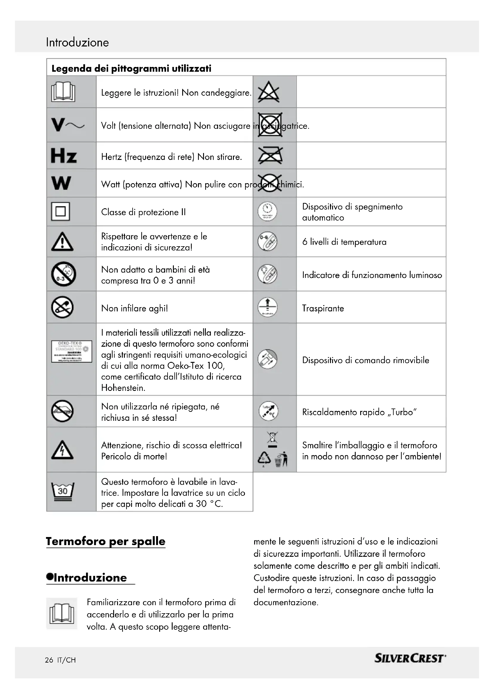 Smaltire l’imballaggio e il termoforo in modo non dannoso per l‘ambiente! Questo termoforo è lavabile in lava- trice. Impostare la lavatrice su un ciclo per capi molto delicati a 30 °C. Termoforo per spalle Introduzione Familiarizzare con il termoforo prima di accenderlo e di utilizzarlo per la prima volta. A questo scopo leggere attenta- mente le seguenti istruzioni d‘uso e le indicazioni di sicurezza importanti. Utilizzare il termoforo solamente come descritto e per gli ambiti indicati. Custodire queste istruzioni. In caso di passaggio del termoforo a terzi, consegnare anche tutta la documentazione. Introduzione / Importanti avvertenze di sicurezza27 IT/CH Introduzione Introduzione / Importanti avvertenze di sicurezza Utilizzo conforme Questo termoforo è destinato al riscaldamento del corpo umano. Esso consente l‘applicazione mirata del calore nella zona delle spalle. Il presente ter- moforo non è concepito per l‘uso negli ospedali o per scopi commerciali. In particolare è vietato riscal- dare neonati, bambini piccoli, persone insensibili al calore o non autosufficienti nonché animali. Un uti- lizzo diverso da quello precedentemente descritto o una modifica del termoforo non sono ammessi e possono provocare lesioni a persone e / o danneg- giamenti dello stesso termoforo. Il produttore non si assume alcuna responsabilità per eventuali danni determinati da un utilizzo non conforme alle indica- zioni fornite. Descrizione dei componenti