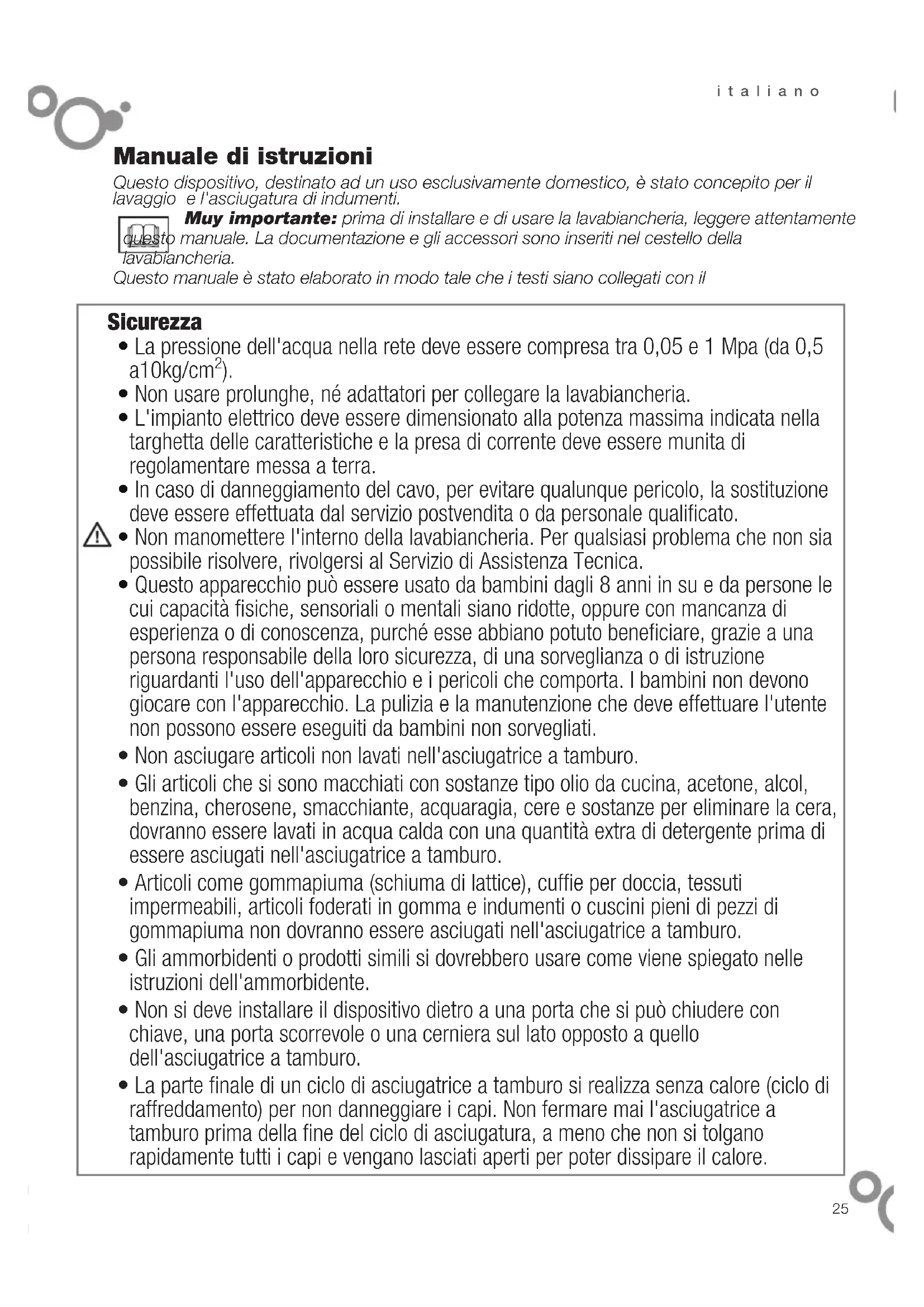 occorre attendere circa 2 minuti per poter aprire l'oblò. Nei modelli “a-b” accertarsi che lampeggi la spia STOP. Nei modelli del tipo “c” attendere che si spenga il simbolo . Una volta terminato il programma di asciugatura, la lavatrice-asciugatrice sarà molto calda, per cui si consiglia di non aprire la porta prima di 2 minuti per evitare ustioni.