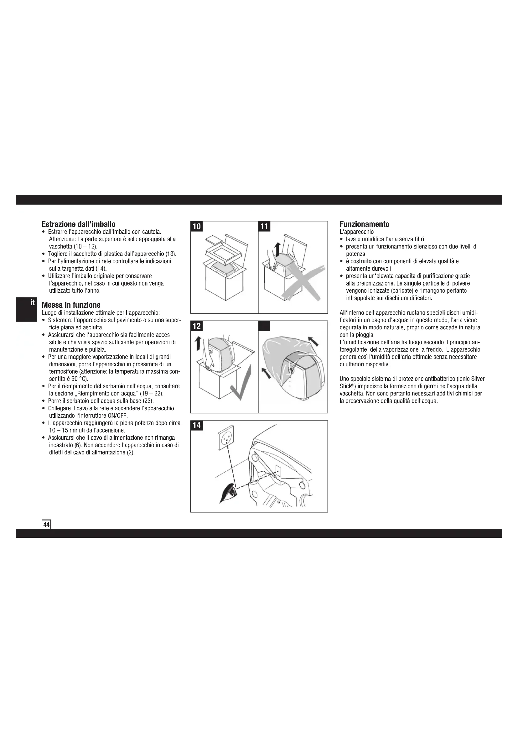 - Estrarre l’apparecchio dall’imballo con cautela. Attenzione: La parte superiore è solo appoggiata alla vaschetta (10 – 12).