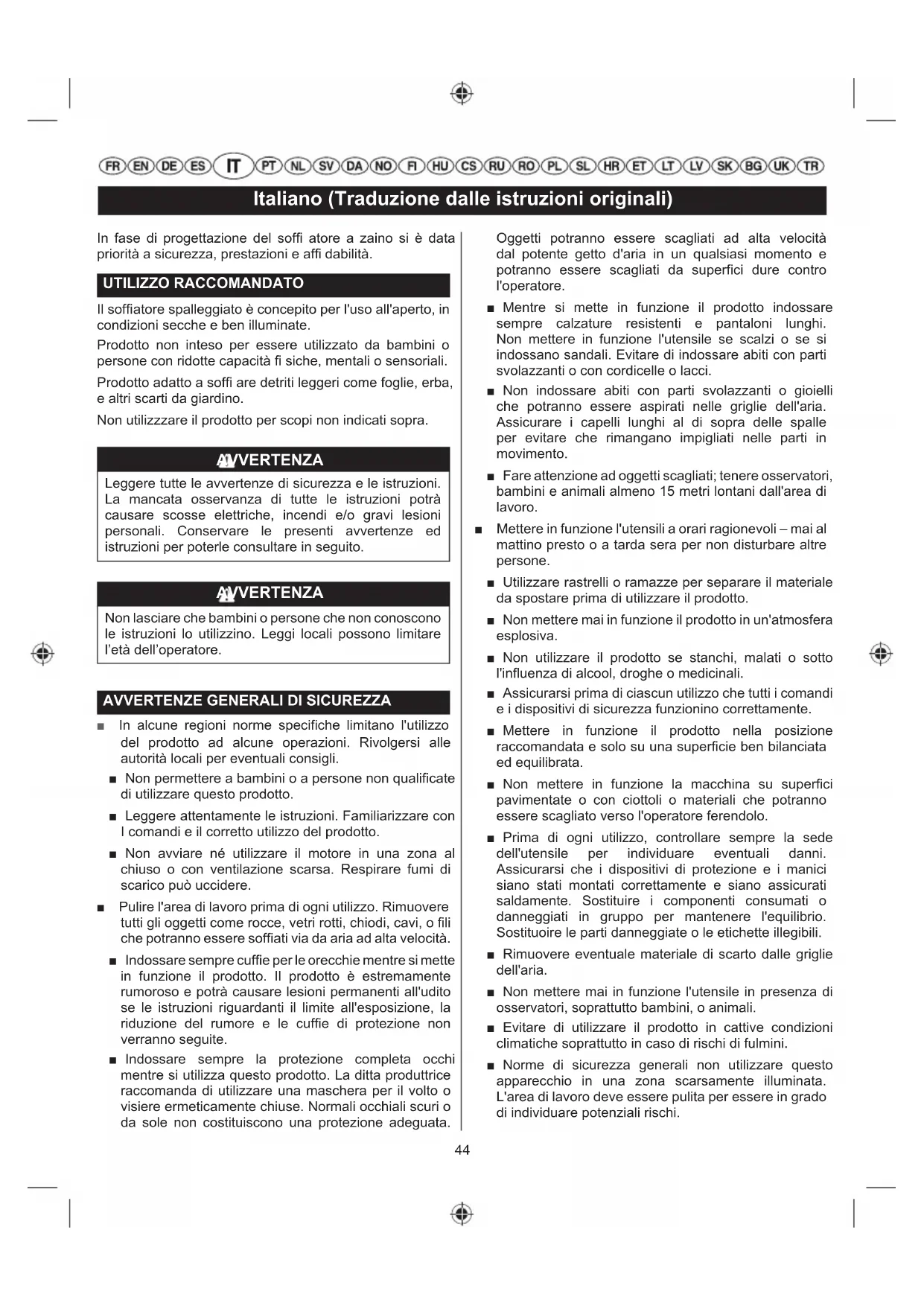 NOTAS: ■ El mantenimiento debe realizarse de forma más frecuente cuando se utilice el aparato en una zona polvorienta. ■ Cuando el producto ha superado el máximo establecido en la tabla, el mantenimiento debería realizarse cíclicamente conforme a los intervalos de tiempo y horas establecidos aquí.44 Italiano (Traduzione dalle istruzioni originali) In fase di progettazione del soffi atore a zaino si è data priorità a sicurezza, prestazioni e affi dabilità. UTILIZZO RACCOMANDATO Il soffi atore spalleggiato è concepito per l'uso all'aperto, in condizioni secche e ben illuminate. Prodotto non inteso per essere utilizzato da bambini o persone con ridotte capacità fi siche, mentali o sensoriali. Prodotto adatto a soffi are detriti leggeri come foglie, erba, e altri scarti da giardino. Non utilizzzare il prodotto per scopi non indicati sopra. AVVERTENZA Leggere tutte le avvertenze di sicurezza e le istruzioni. La mancata osservanza di tutte le istruzioni potrà causare scosse elettriche, incendi e/o gravi lesioni personali. Conservare le presenti avvertenze ed istruzioni per poterle consultare in seguito. AVVERTENZA Non lasciare che bambini o persone che non conoscono le istruzioni lo utilizzino. Leggi locali possono limitare l’età dell’operatore.
