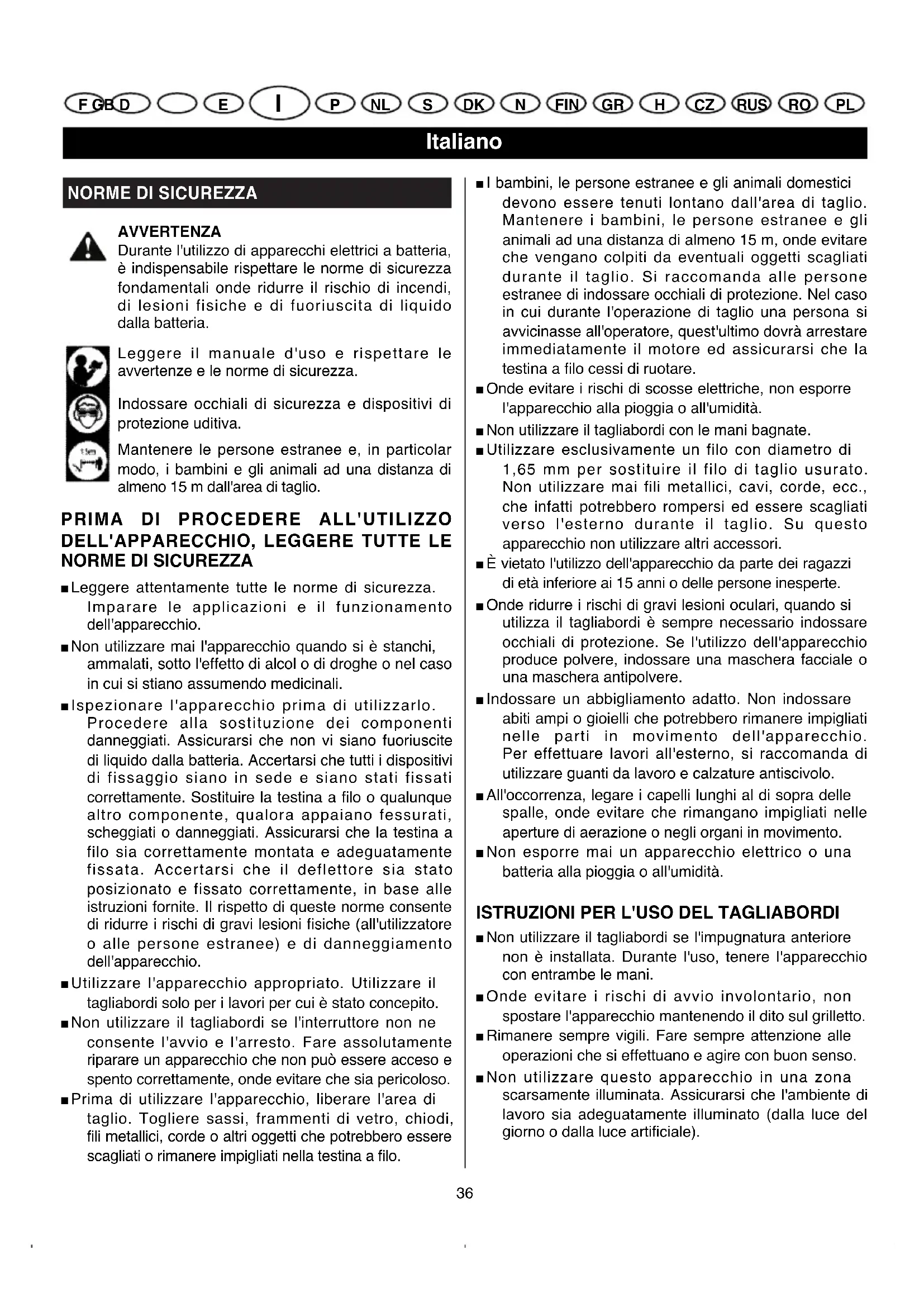 F GB D Español I P NL S DK N FIN GR H CZ RUS RO PL CLT-1423P / 1823 P manual 24/11/04 11:57 Page 35NORME DI SICUREZZA AVVERTENZA Durante l'utilizzo di apparecchi elettrici a batteria, è indispensabile rispettare le norme di sicurezza fondamentali onde ridurre il rischio di incendi, di lesioni fisiche e di fuoriuscita di liquido dalla batteria. Leggere il manuale d'uso e rispettare le avvertenze e le norme di sicurezza. Indossare occhiali di sicurezza e dispositivi di protezione uditiva. Mantenere le persone estranee e, in particolar modo, i bambini e gli animali ad una distanza di almeno 15 m dall'area di taglio.