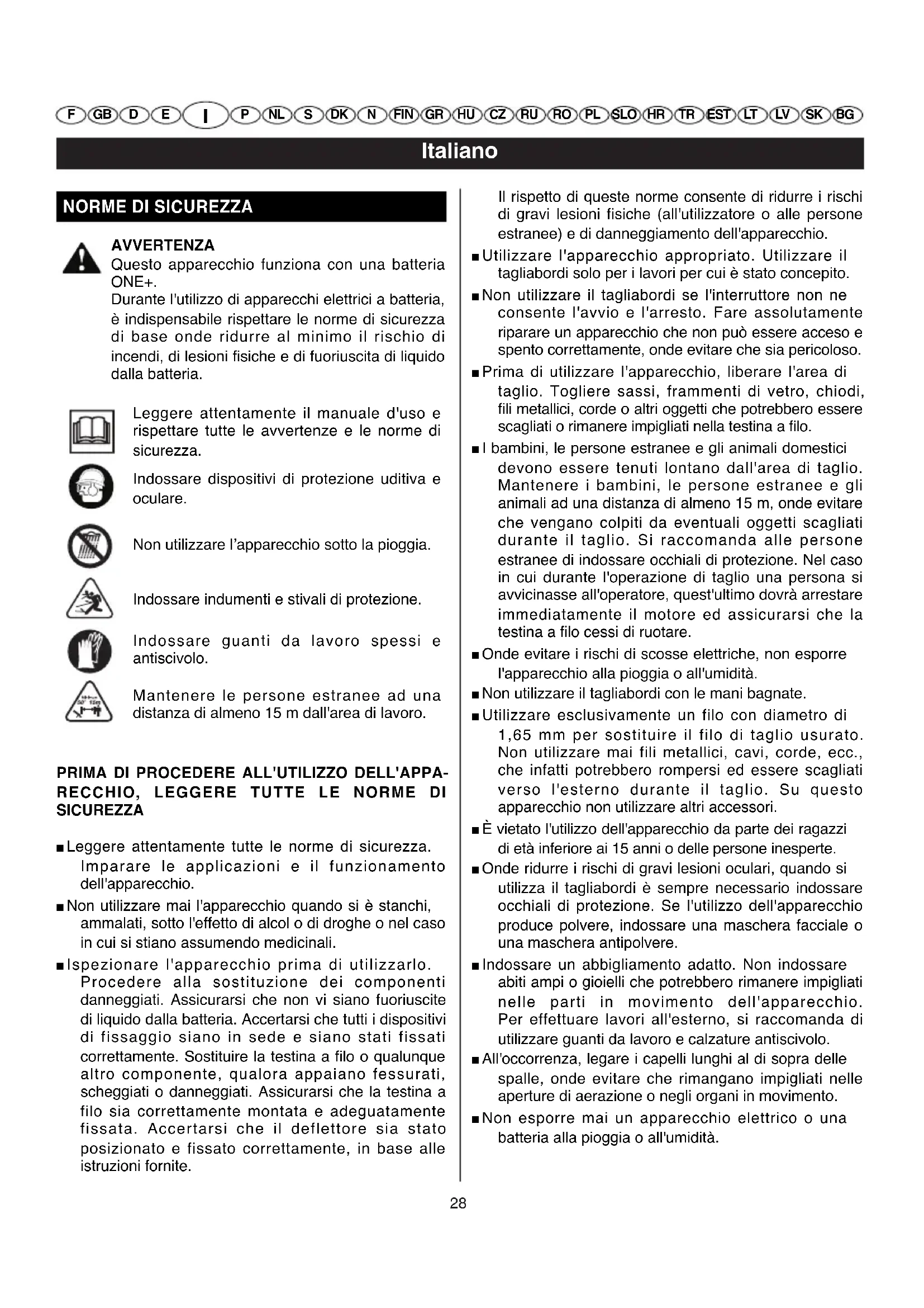 ■ Prima di trasportare l'apparecchio, assicurarsi che i loro componenti siano serrati correttamente. - Conservare le presenti istruzioni. Consultarle regolarmente e utilizzarle per informare altri eventuali utilizzatori. Nel prestare il tagliabordi, fornireanche il presente manuale d'uso.
