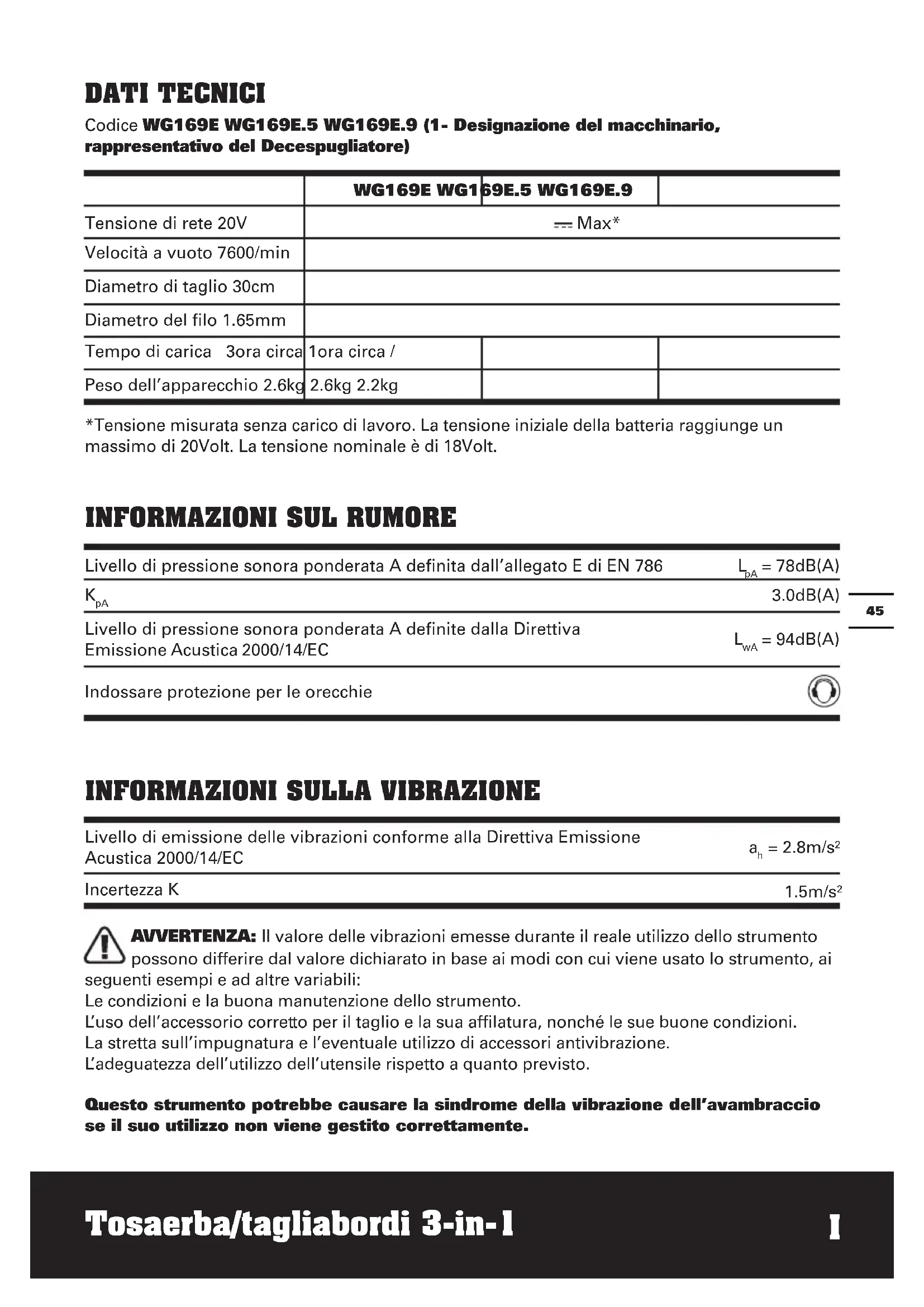 DATI TECNICI Codice WG169E WG169E.5 WG169E.9 (1- Designazione del macchinario, rappresentativo del Decespugliatore) WG169E WG169E.5 WG169E.9 Tensione di rete 20V Max* Velocità a vuoto 7600/min Diametro di taglio 30cm Diametro del filo 1.65mm Tempo di carica 3ora circa 1ora circa / Peso dell’apparecchio 2.6kg 2.6kg 2.2kg *Tensione misurata senza carico di lavoro. La tensione iniziale della batteria raggiunge un massimo di 20Volt. La tensione nominale è di 18Volt.