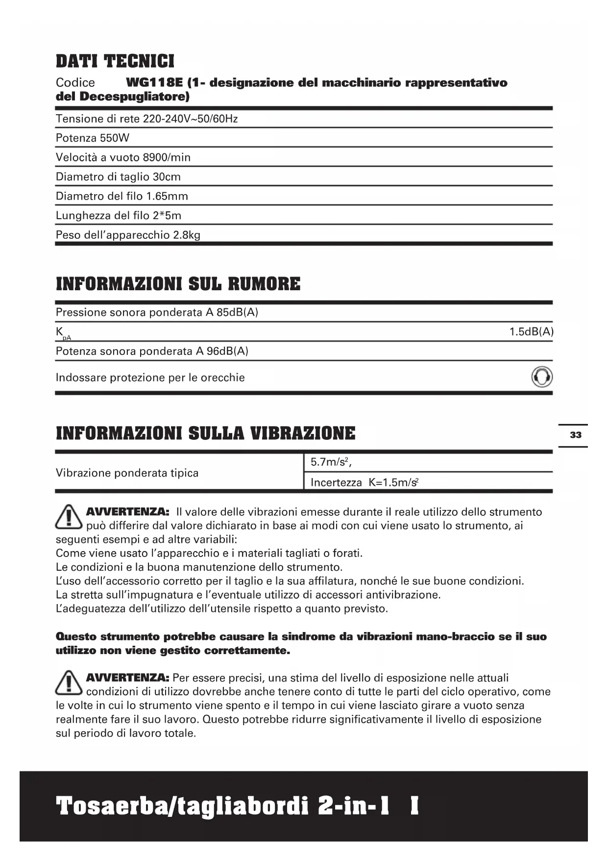 Accessori illustrati o descritti non fanno necessariamente parte del volume di consegna.3332 Tosaerba/tagliabordi 2-in-1 I DATI TECNICI Codice WG118E (1- designazione del macchinario rappresentativo del Decespugliatore) Tensione di rete 220-240V~50/60Hz Potenza 550W Velocità a vuoto 8900/min Diametro di taglio 30cm Diametro del filo 1.65mm Lunghezza del filo 2*5m Peso dell’apparecchio 2.8kg