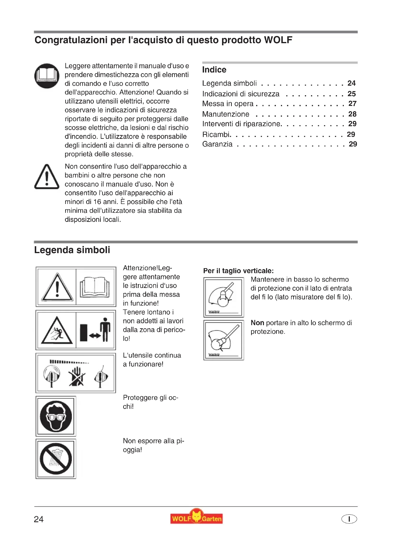 - I Congratulazioni per l'acquisto di questo prodotto WOLF Indice Legenda simboli p. 24