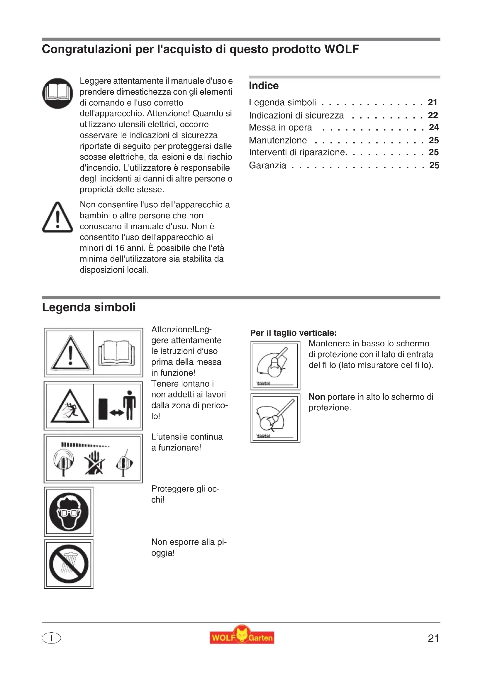 - Garanzia Legenda simboli Leggere attentamente il manuale d'uso e prendere dimestichezza con gli elementi di comando e l'uso corretto dell'apparecchio. Attenzione! Quando si utilizzano utensili elettrici, occorre osservare le indicazioni di sicurezza riportate di seguito per proteggersi dalle scosse elettriche, da lesioni e dal rischio d'incendio. L'utilizzatore è responsabile degli incidenti ai danni di altre persone o proprietà delle stesse. Non consentire l'uso dell'apparecchio a bambini o altre persone che non conoscano il manuale d'uso. Non è consentito l'uso dell'apparecchio ai minori di 16 anni. È possibile che l'età minima dell'utilizzatore sia stabilita da disposizioni locali. Attenzione!Leg- gere attentamente le istruzioni d‘uso prima della messa in funzione! Tenere lontano i non addetti ai lavori dalla zona di perico- lo! L‘utensile continua a funzionare! Proteggere gli oc- chi! Non esporre alla pi- oggia! Per il taglio verticale: Mantenere in basso lo schermo di protezione con il lato di entrata del fi lo (lato misuratore del fi lo). Non portare in alto lo schermo di protezione. Istruzioni per l'uso originali22 p. 25