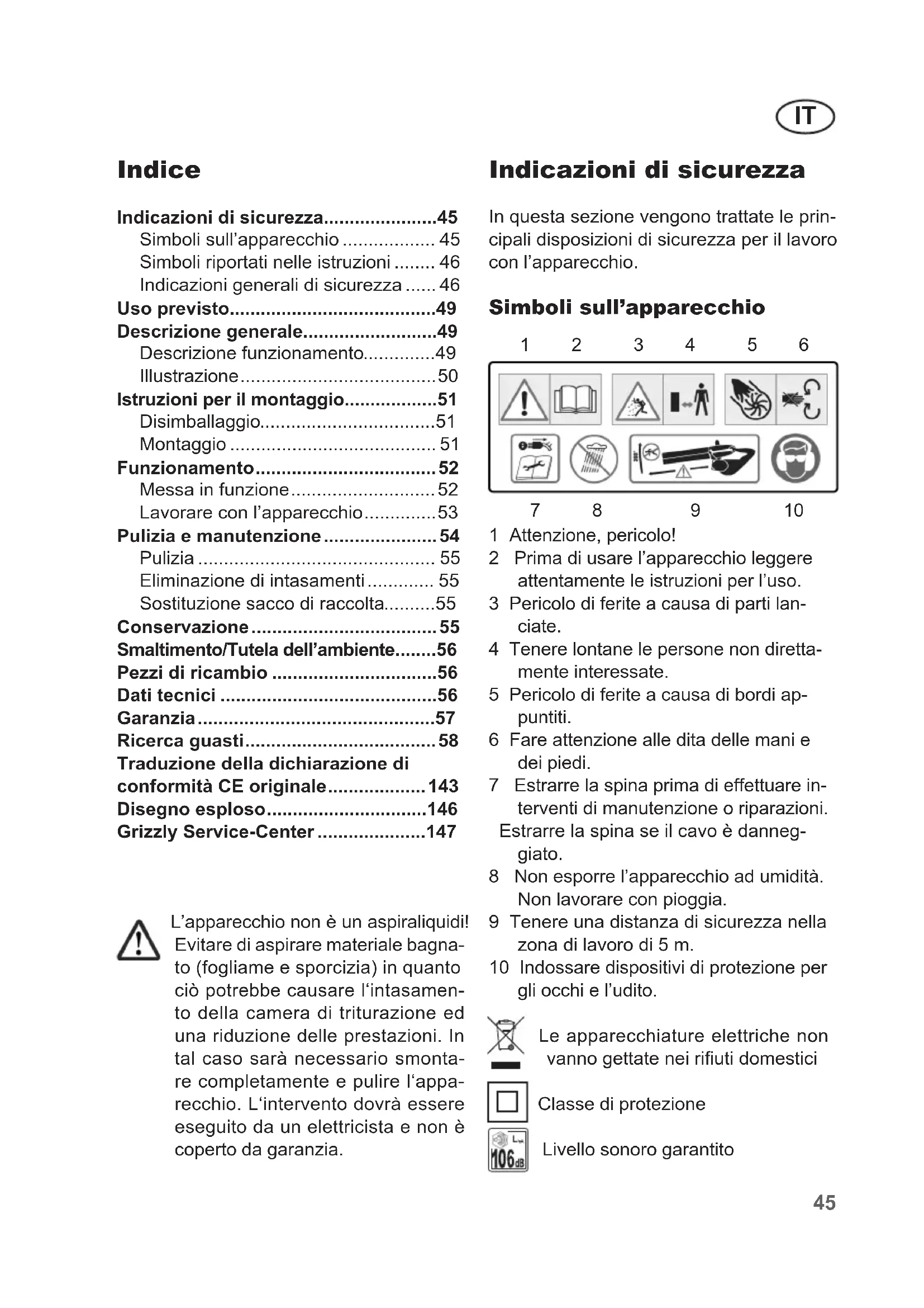 L'apparecchio non è un aspiraliquidi! Evitare di aspirare materiale bagnato (fogliame e sporcizia) in quanto ciò potrebbe causare l'intasamento della camera di triturazione ed una riduzione delle prestazioni. In tal caso sare necessario smontare completeness e pulire l'apparecchio. L'intervento dovrá essere eseguito da un elettricista e non è coperto da garanzia.