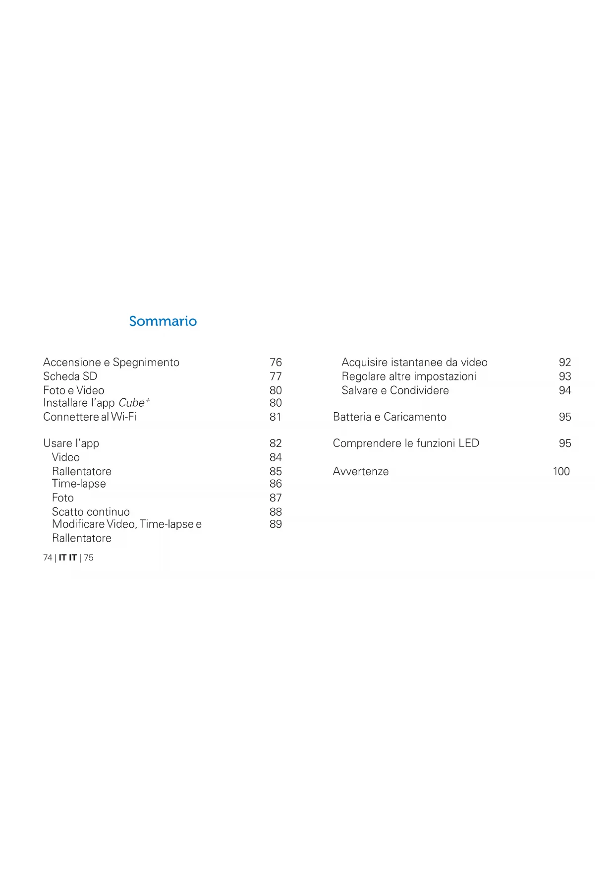 Connettere al Wi-Fi Usare l’app Video Rallentatore Time-lapse Foto Scatto continuo Modificare Video, Time-lapse e Rallentatore Acquisire istantanee da video Regolare altre impostazioni Salvare e Condividere Batteria e Caricamento Comprendere le funzioni LED Avvertenze Sommario