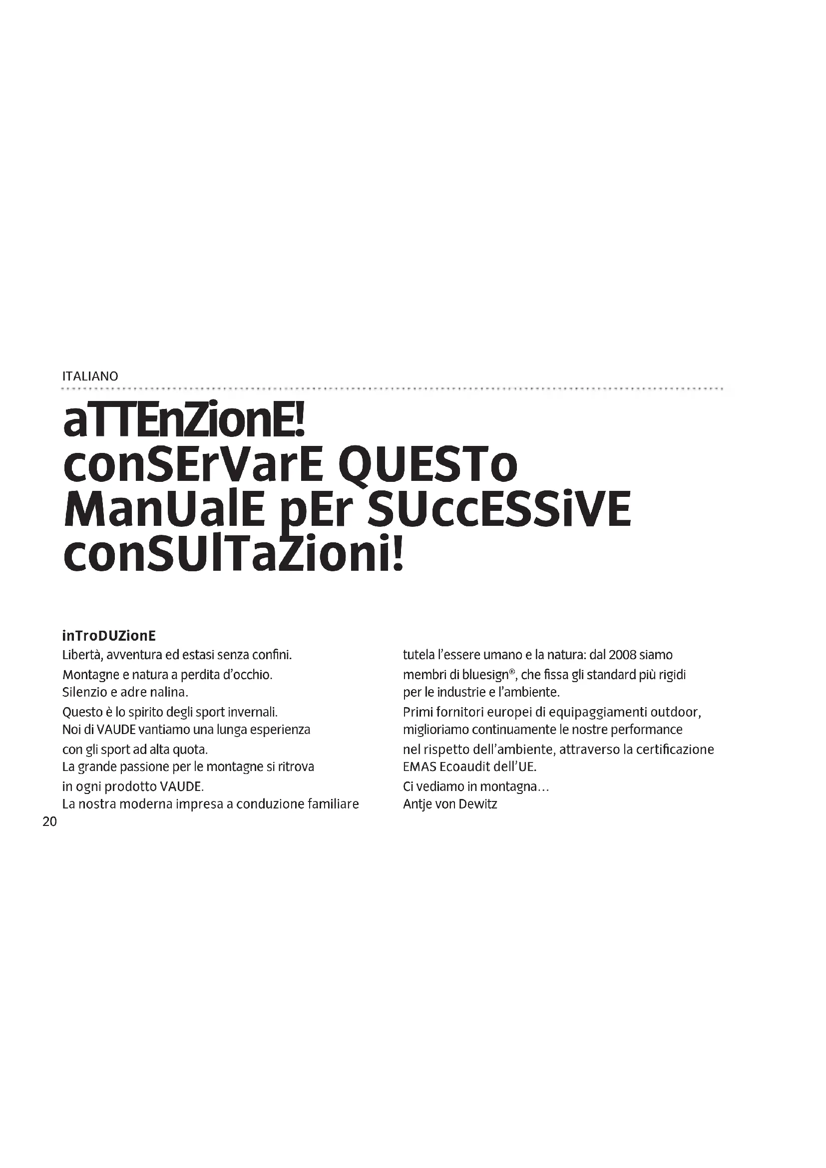 - Ne tendez jamais les cordons et haubans sur des sentiers piétons, dans l’obscurité, cela représente un grand risque de chute.20 ITALIANO aTTEnZionE! conSErvarE QUESTo ManUalE pEr SUccESSivE conSUlTaZioni! inTroDUZionE Libertà, avventura ed estasi senza confini. Montagne e natura a perdita d’occhio. Silenzio e adre nalina. Questo è lo spirito degli sport invernali. Noi di VAUDE vantiamo una lunga esperienza con gli sport ad alta quota. La grande passione per le montagne si ritrova in ogni prodotto VAUDE. La nostra moderna impresa a conduzione familiare tutela l’essere umano e la natura: dal 2008 siamo membri di bluesign®, che fissa gli standard più rigidi per le industrie e l’ambiente. Primi fornitori europei di equipaggiamenti outdoor, miglioriamo continuamente le nostre performance nel rispetto dell’ambiente, attraverso la certificazione EMAS Ecoaudit dell’UE. Ci vediamo in montagna… Antje von Dewitz21 ITALIANO ScElTa DEl lUogo: