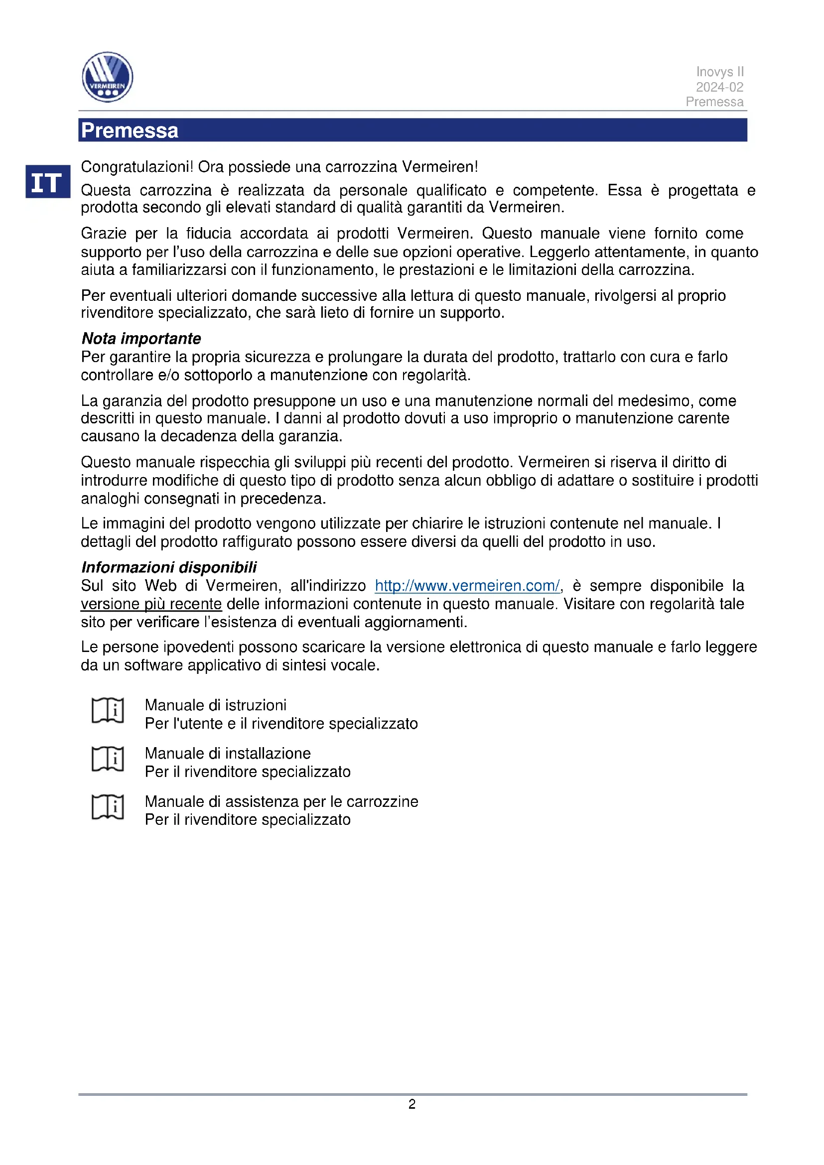 Premessa Congratulazioni! Ora possiede una carrozzina Vermeiren! Questa carrozzina è realizzata da personale qualificato e competente. Essa è progettata e prodotta secondo gli elevati standard di qualità garantiti da Vermeiren. Grazie per la fiducia accordata ai prodotti Vermeiren. Questo manuale viene fornito come supporto per l’uso della carrozzina e delle sue opzioni operative. Leggerlo attentamente, in quanto aiuta a familiarizzarsi con il funzionamento, le prestazioni e le limitazioni della carrozzina. Per eventuali ulteriori domande successive alla lettura di questo manuale, rivolgersi al proprio rivenditore specializzato, che sarà lieto di fornire un supporto. Nota importante Per garantire la propria sicurezza e prolungare la durata del prodotto, trattarlo con cura e farlo controllare e/o sottoporlo a manutenzione con regolarità. La garanzia del prodotto presuppone un uso e una manutenzione normali del medesimo, come descritti in questo manuale. I danni al prodotto dovuti a uso improprio o manutenzione carente causano la decadenza della garanzia. Questo manuale rispecchia gli sviluppi più recenti del prodotto. Vermeiren si riserva il diritto di introdurre modifiche di questo tipo di prodotto senza alcun obbligo di adattare o sostituire i prodotti analoghi consegnati in precedenza. Le immagini del prodotto vengono utilizzate per chiarire le istruzioni contenute nel manuale. I dettagli del prodotto raffigurato possono essere diversi da quelli del prodotto in uso. Informazioni disponibili Sul sito Web di Vermeiren, all'indirizzo http://www.vermeiren.com/, è sempre disponibile la versione più recente delle informazioni contenute in questo manuale. Visitare con regolarità tale sito per verificare l’esistenza di eventuali aggiornamenti. Le persone ipovedenti possono scaricare la versione elettronica di questo manuale e farlo leggere da un software applicativo di sintesi vocale.
