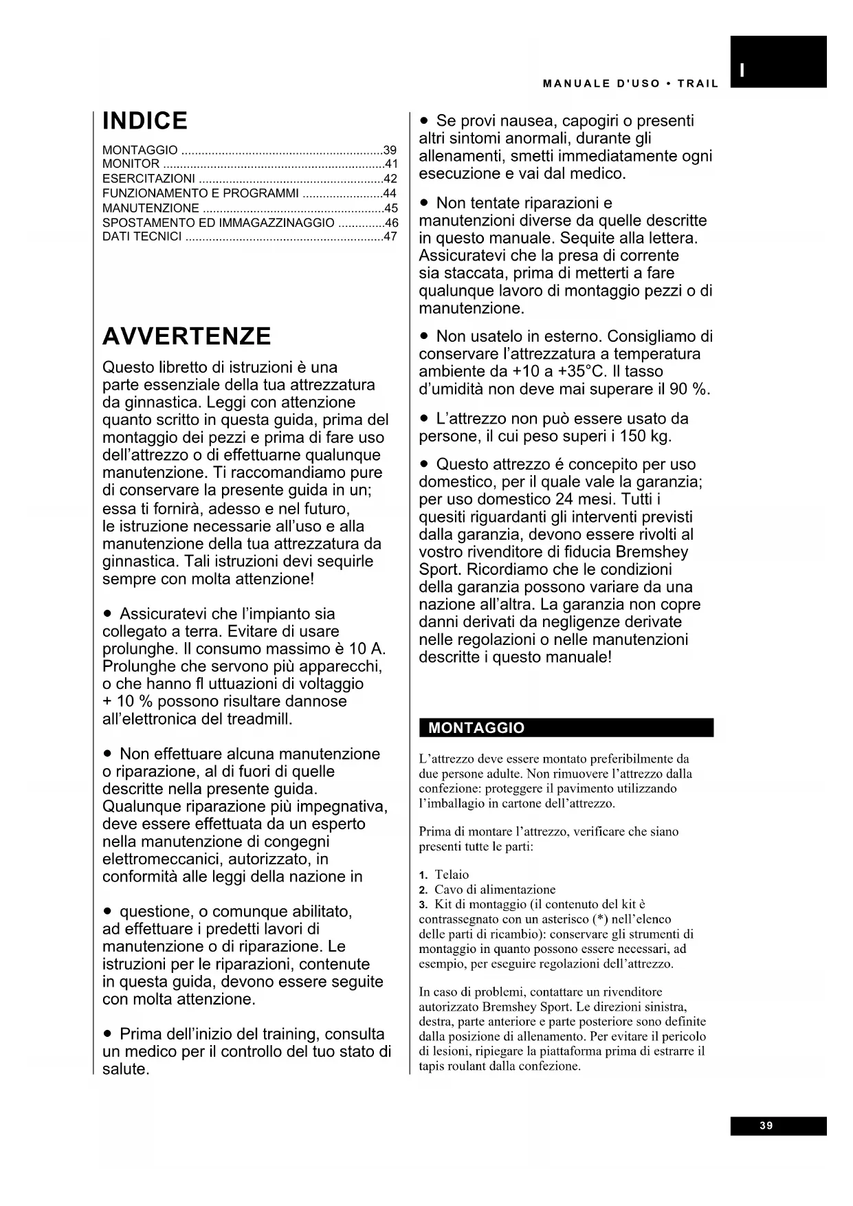In caso di problemi, contattare un rivenditore autorizzato Bremshcy Sport. Le direzioni sinistra, destra, parte anteriore e parte posteriori sono definite alla posizione di allenamento. Per evitare il pericololo di lesionsi, ripiegare la piattaforma prima di estrarre il tapis roulant alla confezione.