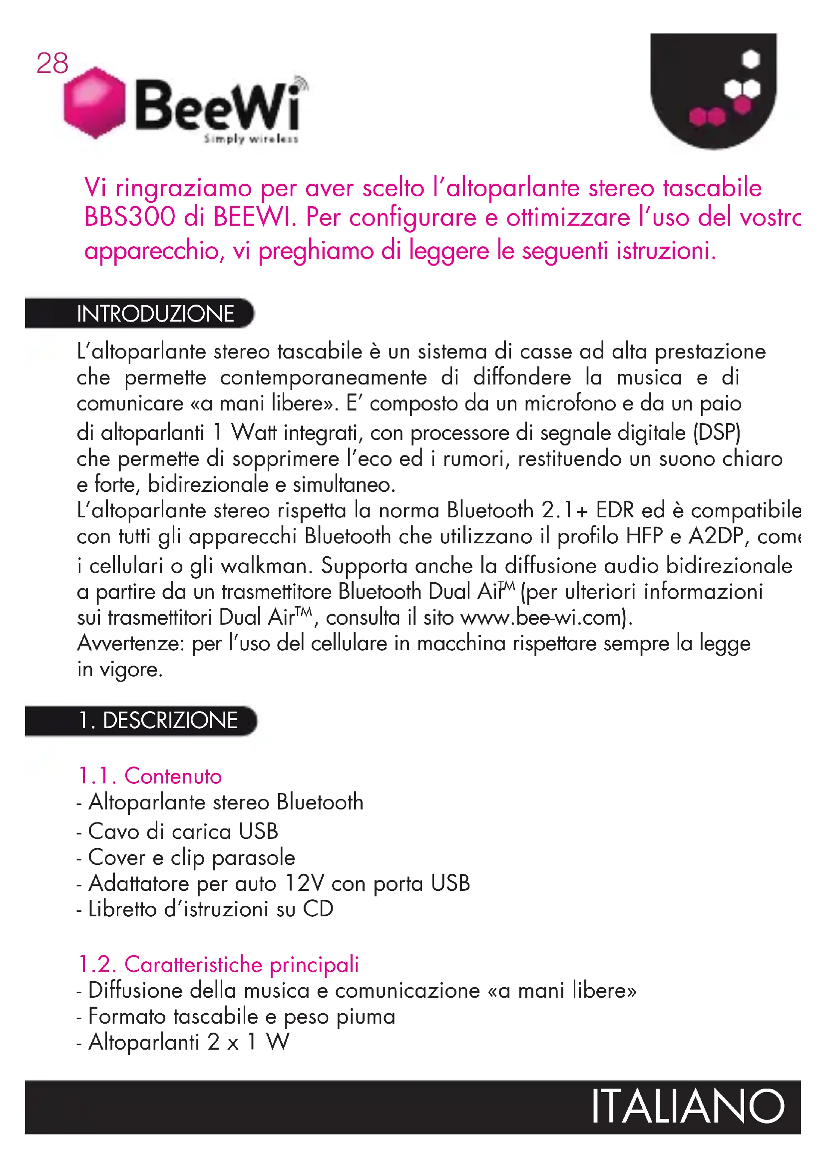 , consulta il sito www.bee-wi.com). Avvertenze: per l’uso del cellulare in macchina rispettare sempre la legge in vigore. 1.1. Contenuto - Altoparlante stereo Bluetooth - Cavo di carica USB - Cover e clip parasole - Adattatore per auto 12V con porta USB - Libretto d’istruzioni su CD 1.2. Caratteristiche principali - Diffusione della musica e comunicazione «a mani libere» - Formato tascabile e peso piuma - Altoparlanti 2 x 1 W INTRODUZIONE Vi ringraziamo per aver scelto l’altoparlante stereo tascabile BBS300 di BEEWI. Per configurare e ottimizzare l’uso del vostro apparecchio, vi preghiamo di leggere le seguenti istruzioni.