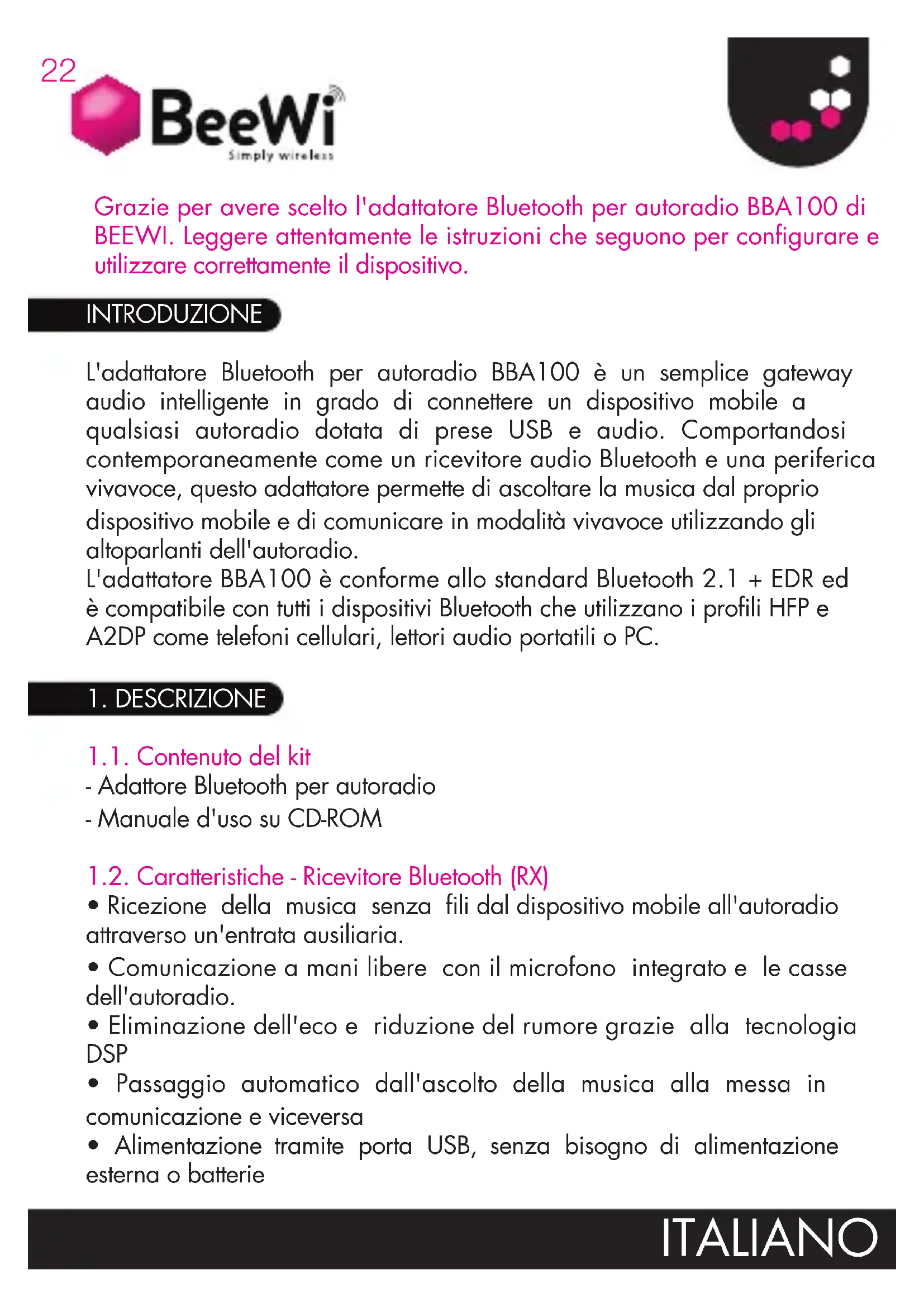 - Tutte le altre Direttive UE rilevanti La nostra dichiarazione di conformità (DoC: Declaration of Conformity) alla Direttiva 1999/5/EC (Direttiva R&TTE) può essere visualizzata sul sito www.bee-wi.com. Salvaguardia dell’ambiente con il riciclaggio Non smaltire i dispositivi o gli accessori elettrici con i rifi uti domestici. Alcuni paesi o regioni prevedono sistemi di raccolta differenziata per lo smaltimento di materiali elettrici ed elettronici. Per ulteriori informazioni, contattare le autorità locali. Copyright ed altre informazioni di legali BEEWI è una marca registrata. I marchi Apple, “Made for iPod”, “Works with iPhone” e Bluetooth sono marchi di proprietà ed vengono utilizzati dalla BEEWI sotto licenza. Tutti gli altri prodotti o nomi di servizi appartengono ai rispettivi proprietari. L’uso di dispositivi wireless ed i loro accessori possono essere proibiti o limitati in determinate zone, si raccomanda pertanto di seguire sempre le leggi ed i regolamenti sull’uso di questi prodotti. Questo prodotto è coperto da una garanzia di 2 anni, valida a decorrere dalla data dell’acquisto. Gli utenti non posso apportare in nessun modo cambiamenti o modifiche al dispositivo. Cambiamenti o modifiche non espressamente approvati dalla parte responsabile della conformità del dispositivo invalideranno la garanzia dell’utente.Per ulteriori informazioni visitare il nostro sito internet www.bee-wi.com. Supporto tecnico: support@bee-wi.com. © VOXLAND, 201028 ESPAÑOL El adaptador Bluetooth para autoradio BBA100 es una simple pasarela de audio inteligente para conectar su aparato móvil a cualquier autoradio equipado con tomas USB y audio. Comportándose a la vez como un receptor de audio Bluetooth y como un periférico manos libres, el adaptador le permite escuchar la música de su aparato móvil y comunicarse en modo manos libres utilizando los altavoces del autoradio. El adaptador BBA100 sigue la norma Bluetooth 2.1+EDR y es compatible con todos los aparatos Bluetooth que utilizan los perfiles HFP y A2DP, como teléfonos móviles, walkman u ordenadores. 1.1. Contenido del pack - Adaptador de autoradio Bluetooth - CDROM con manual del usuario 1.2. Características - Receptor Bluetooth (RX)