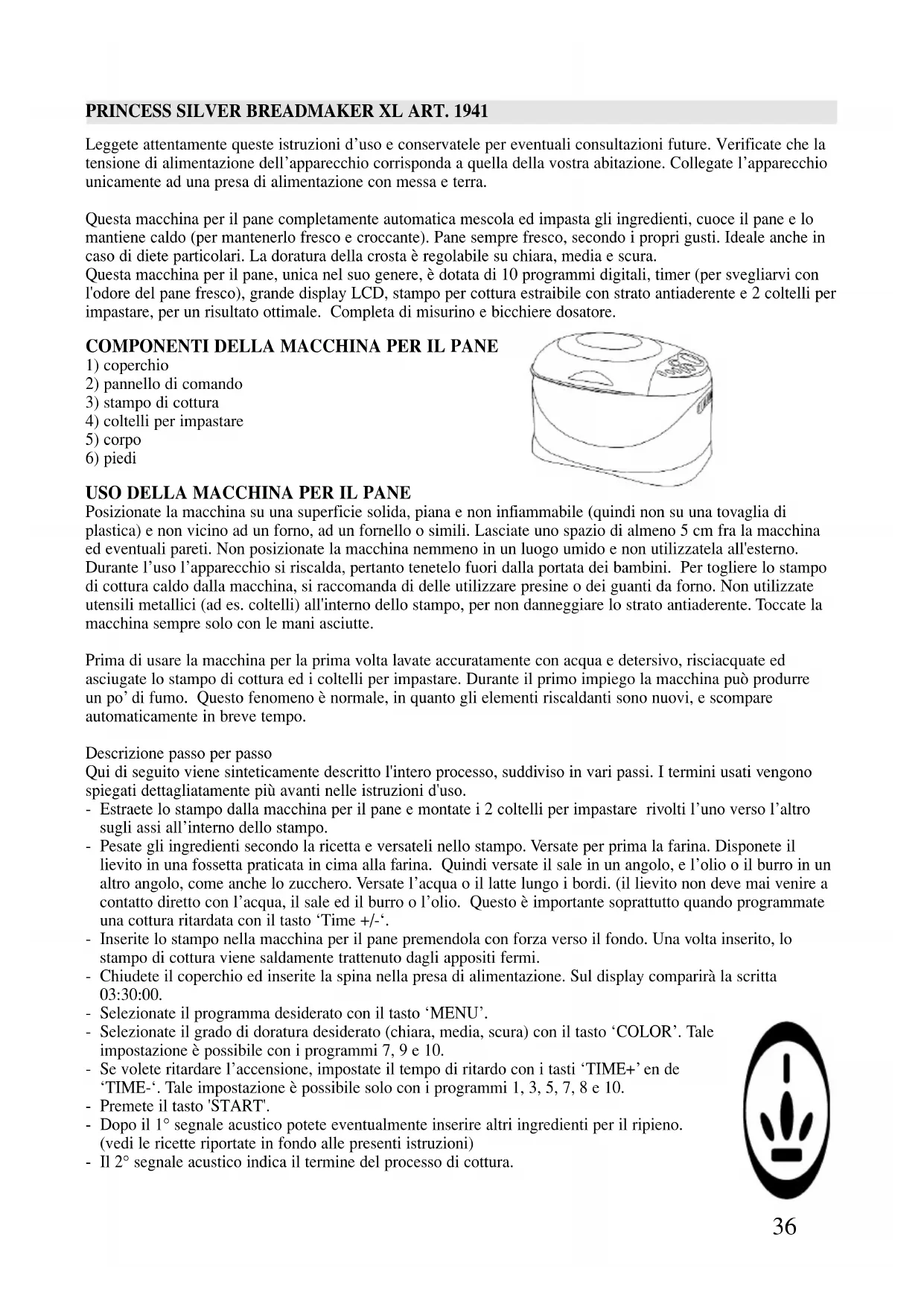 Posizionate la macchina su una superficie solida, piana e non infiammabile (quindi non su una tovaglia di plastica) e non vicino ad un forno, ad un fornello o simili. Lasciate uno spazio di almeno 5 cm fra la macchina ed eventuali pareti. Non posizionate la macchina nemmeno in un luogo umido e non utilizzatela all'esterno. Durante l’uso l’apparecchio si riscalda, pertanto tenetelo fuori dalla portata dei bambini. Per togliere lo stampo di cottura caldo dalla macchina, si raccomanda di delle utilizzare presine o dei guanti da forno. Non utilizzate utensili metallici (ad es. coltelli) all'interno dello stampo, per non danneggiare lo strato antiaderente. Toccate la macchina sempre solo con le mani asciutte. Prima di usare la macchina per la prima volta lavate accuratamente con acqua e detersivo, risciacquate ed asciugate lo stampo di cottura ed i coltelli per impastare. Durante il primo impiego la macchina può produrre un po’ di fumo. Questo fenomeno è normale, in quanto gli elementi riscaldanti sono nuovi, e scompare automaticamente in breve tempo. Descrizione passo per passo Qui di seguito viene sinteticamente descritto l'intero processo, suddiviso in vari passi. I termini usati vengono spiegati dettagliatamente più avanti nelle istruzioni d'uso. - Estraete lo stampo dalla macchina per il pane e montate i 2 coltelli per impastare rivolti l’uno verso l’altro sugli assi all’interno dello stampo. - Pesate gli ingredienti secondo la ricetta e versateli nello stampo. Versate per prima la farina. Disponete il lievito in una fossetta praticata in cima alla farina. Quindi versate il sale in un angolo, e l’olio o il burro in un altro angolo, come anche lo zucchero. Versate l’acqua o il latte lungo i bordi. (il lievito non deve mai venire a contatto diretto con l’acqua, il sale ed il burro o l’olio. Questo è importante soprattutto quando programmate una cottura ritardata con il tasto ‘Time +/-‘. - Inserite lo stampo nella macchina per il pane premendola con forza verso il fondo. Una volta inserito, lo stampo di cottura viene saldamente trattenuto dagli appositi fermi. - Chiudete il coperchio ed inserite la spina nella presa di alimentazione. Sul display comparirà la scritta 03:30:00. - Selezionate il programma desiderato con il tasto ‘MENU’. - Selezionate il grado di doratura desiderato (chiara, media, scura) con il tasto ‘COLOR’. Tale impostazione è possibile con i programmi 7, 9 e 10. - Se volete ritardare l’accensione, impostate il tempo di ritardo con i tasti ‘TIME+’ en de ‘TIME-‘. Tale impostazione è possibile solo con i programmi 1, 3, 5, 7, 8 e 10. - Premete il tasto 'START'. - Dopo il 1° segnale acustico potete eventualmente inserire altri ingredienti per il ripieno. (vedi le ricette riportate in fondo alle presenti istruzioni) - Il 2° segnale acustico indica il termine del processo di cottura.37 - ATTENZIONE! Lo stampo ed il pane sono caldi! Indossate dei guanti da forno per togliere lo stampo dalla macchina ed estrarre il pane dallo stampo. Lasciate raffreddare il pane su una griglia. - ATTENZIONE: Può accadere che i coltelli per impastare rimangano nel pane. In tal caso sarà sufficiente estrarli delicatamente. Fate però attenzione perché i coltelli sono caldi! - Se volete cuocere un altro pane, dovete attendere alcuni minuti perché la macchina per il pane si raffreddi sufficientemente. Se la macchina per il pane non si è ancora sufficientemente raffreddata, essa emette un segnale acustico e compare il messaggio ‘HHH’ sul display. - Dopo la cottura, spegnete l'apparecchio e togliete la spina dalla presa di alimentazione. - Per tagliare il pane fresco si consiglia di utilizzare il coltello elettrico Princess (art. 2952)