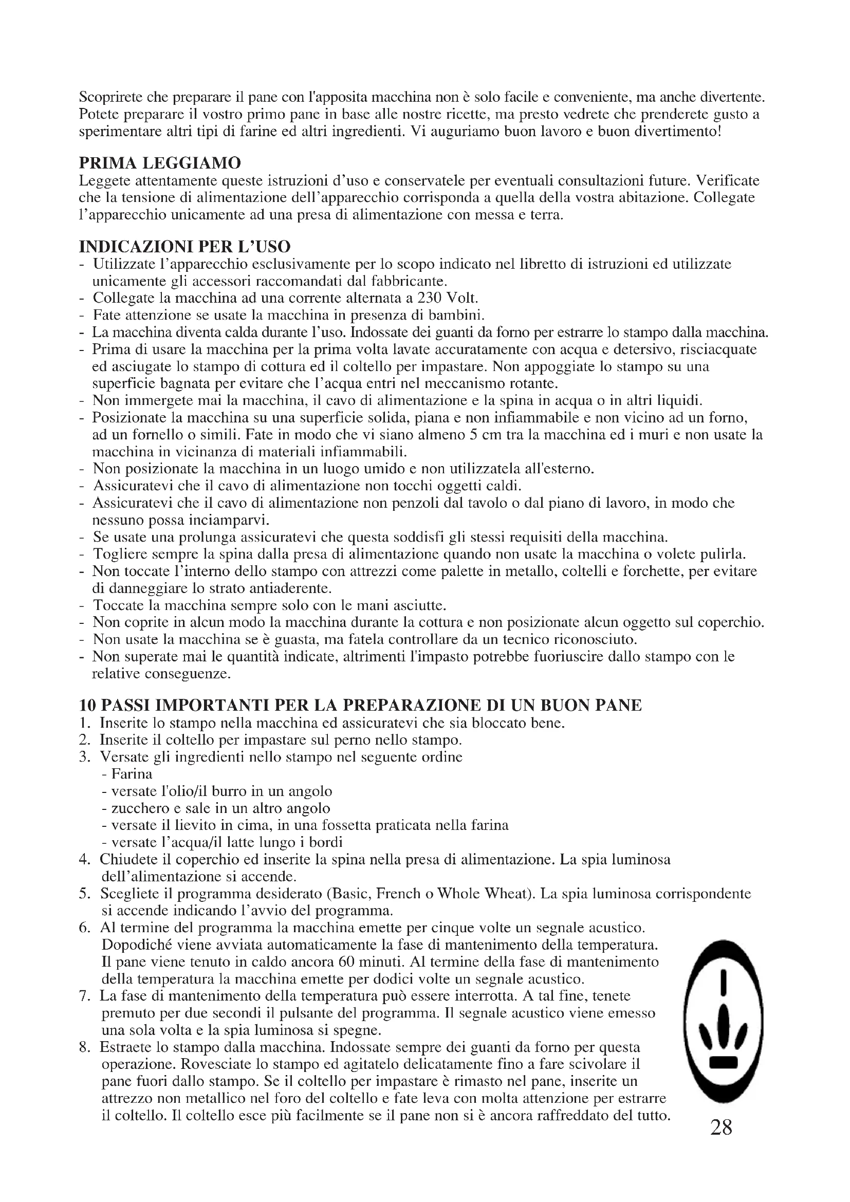 - Utilizzate l’apparecchio esclusivamente per lo scopo indicato nel libretto di istruzioni ed utilizzate unicamente gli accessori raccomandati dal fabbricante. - Collegate la macchina ad una corrente alternata a 230 Volt. - Fate attenzione se usate la macchina in presenza di bambini. - La macchina diventa calda durante l’uso. Indossate dei guanti da forno per estrarre lo stampo dalla macchina. - Prima di usare la macchina per la prima volta lavate accuratamente con acqua e detersivo, risciacquate ed asciugate lo stampo di cottura ed il coltello per impastare. Non appoggiate lo stampo su una superficie bagnata per evitare che l’acqua entri nel meccanismo rotante. - Non immergete mai la macchina, il cavo di alimentazione e la spina in acqua o in altri liquidi. - Posizionate la macchina su una superficie solida, piana e non infiammabile e non vicino ad un forno, ad un fornello o simili. Fate in modo che vi siano almeno 5 cm tra la macchina ed i muri e non usate la macchina in vicinanza di materiali infiammabili. - Non posizionate la macchina in un luogo umido e non utilizzatela all'esterno. - Assicuratevi che il cavo di alimentazione non tocchi oggetti caldi. - Assicuratevi che il cavo di alimentazione non penzoli dal tavolo o dal piano di lavoro, in modo che nessuno possa inciamparvi. - Se usate una prolunga assicuratevi che questa soddisfi gli stessi requisiti della macchina. - Togliere sempre la spina dalla presa di alimentazione quando non usate la macchina o volete pulirla. - Non toccate l’interno dello stampo con attrezzi come palette in metallo, coltelli e forchette, per evitare di danneggiare lo strato antiaderente. - Toccate la macchina sempre solo con le mani asciutte. - Non coprite in alcun modo la macchina durante la cottura e non posizionate alcun oggetto sul coperchio. - Non usate la macchina se è guasta, ma fatela controllare da un tecnico riconosciuto. - Non superate mai le quantità indicate, altrimenti l'impasto potrebbe fuoriuscire dallo stampo con le relative conseguenze. 10 PASSI IMPORTANTI PER LA PREPARAZIONE DI UN BUON PANE