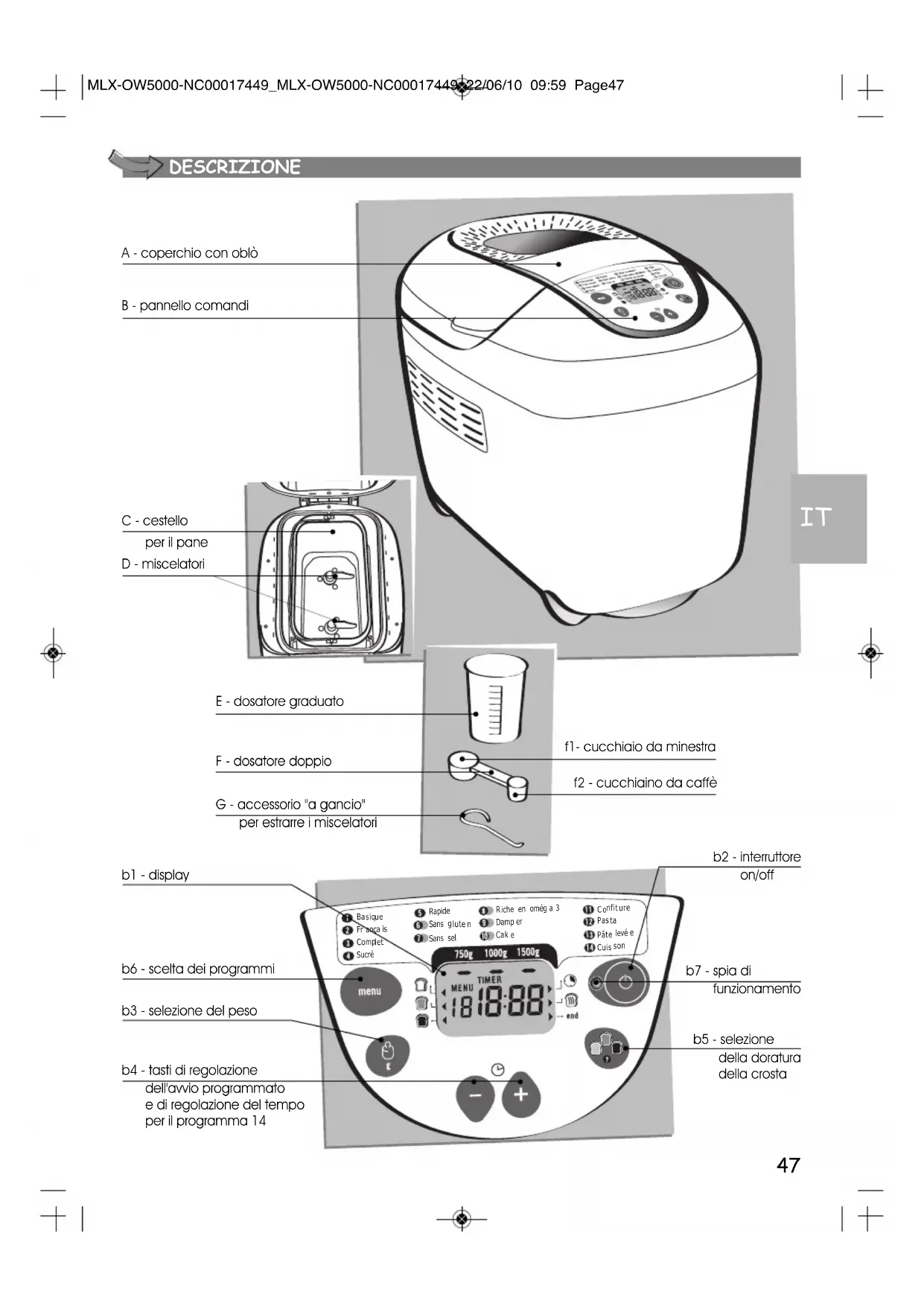 Pâte levé e Cuis son A - coperchio con oblò b6 - scelta dei programmi b4 - tasti di regolazione dell'avvio programmato e di regolazione del tempo per il programma 14 b1 - display b3 - selezione del peso b2 - interruttore on/off b7 - spia di funzionamento b5 - selezione della doratura della crosta B - pannello comandi C - cestello per il pane D - miscelatori E - dosatore graduato F - dosatore doppio f1- cucchiaio da minestra f2 - cucchiaino da caffè G - accessorio "a gancio" per estrarre i miscelatori