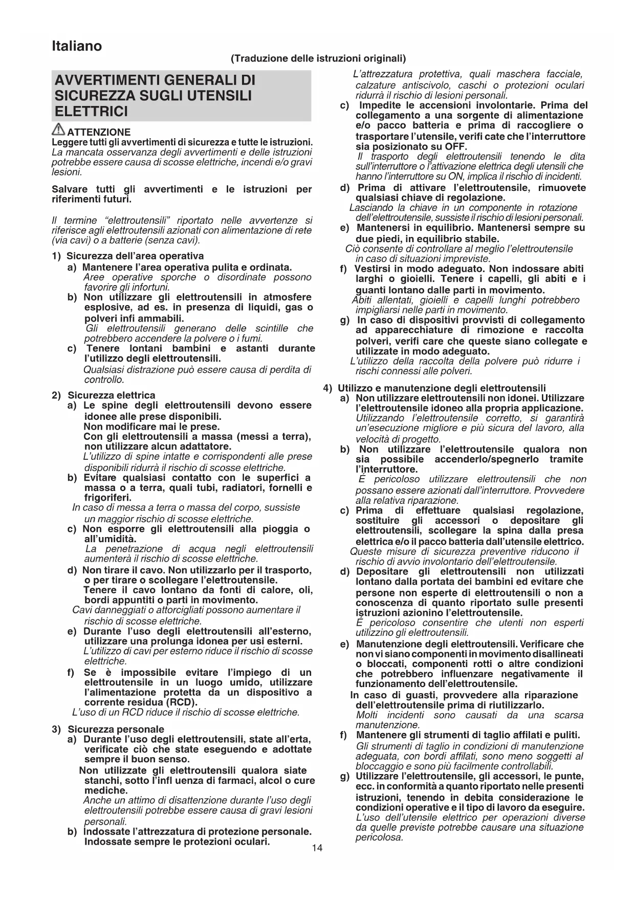 ELETTRICI ATTENZIONE Leggere tutti gli avvertimenti di sicurezza e tutte le istruzioni. La mancata osservanza degli avvertimenti e delle istruzioni potrebbe essere causa di scosse elettriche, incendi e/o gravi lesioni. Salvare tutti gli avvertimenti e le istruzioni per riferimenti futuri. Il termine “elettroutensili” riportato nelle avvertenze si riferisce agli elettroutensili azionati con alimentazione di rete (via cavi) o a batterie (senza cavi).