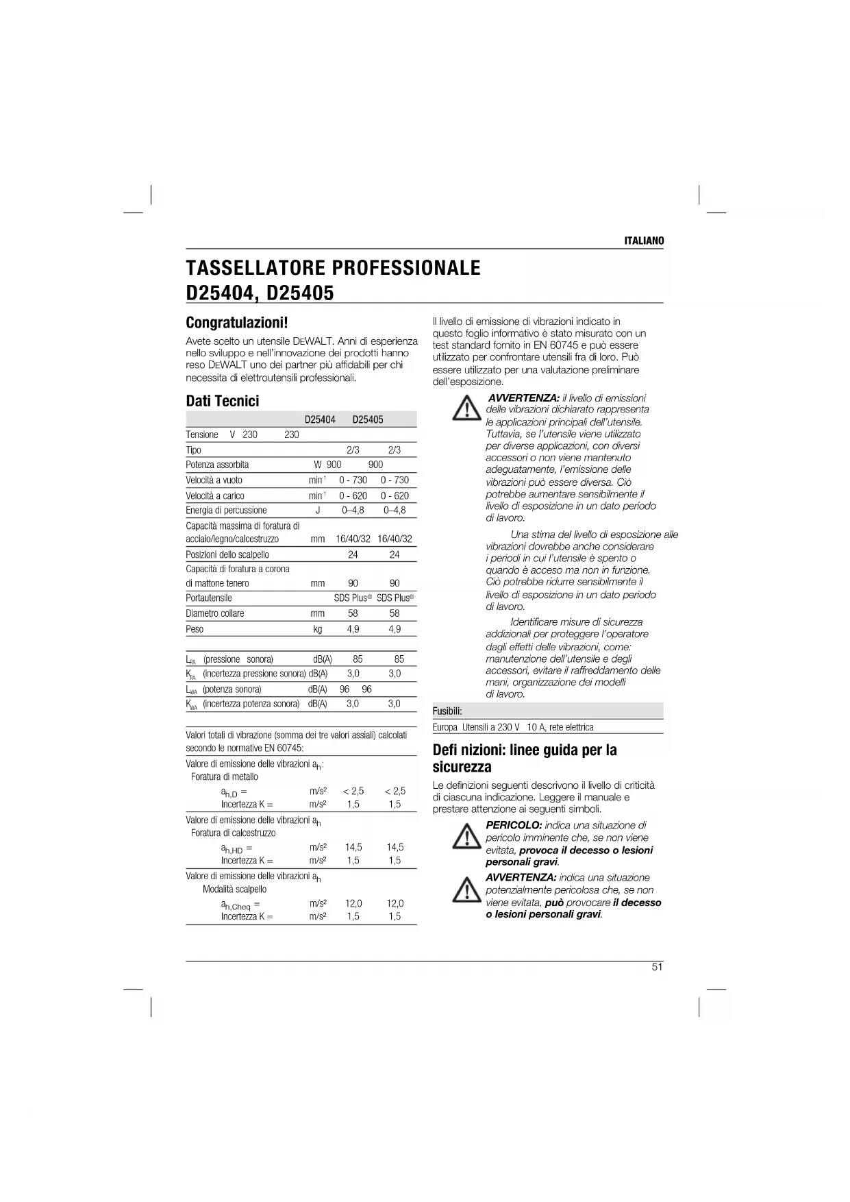 TASSELLATORE PROFESSIONALE D25404, D25405 Il livello di emissione di vibrazioni indicato in questo foglio informativo è stato misurato con un test standard fornito in EN 60745 e può essere utilizzato per confrontare utensili fra di loro. Può essere utilizzato per una valutazione preliminare dell’esposizione. AVVERTENZA: il livello di emissioni delle vibrazioni dichiarato rappresenta le applicazioni principali dell’utensile. Tuttavia, se l’utensile viene utilizzato per diverse applicazioni, con diversi accessori o non viene mantenuto adeguatamente, l’emissione delle vibrazioni può essere diversa. Ciò potrebbe aumentare sensibilmente il livello di esposizione in un dato periodo di lavoro. Una stima del livello di esposizione alle vibrazioni dovrebbe anche considerare i periodi in cui l’utensile è spento o quando è acceso ma non in funzione. Ciò potrebbe ridurre sensibilmente il livello di esposizione in un dato periodo di lavoro. Identificare misure di sicurezza addizionali per proteggere l’operatore dagli effetti delle vibrazioni, come: manutenzione dell’utensile e degli accessori, evitare il raffreddamento delle mani, organizzazione dei modelli di lavoro. Fusibili: Europa Utensili a 230 V 10 A, rete elettrica Defi nizioni: linee guida per la sicurezza Le definizioni seguenti descrivono il livello di criticità di ciascuna indicazione. Leggere il manuale e prestare attenzione ai seguenti simboli. PERICOLO: indica una situazione di pericolo imminente che, se non viene evitata, provoca il decesso o lesioni personali gravi. AVVERTENZA: indica una situazione potenzialmente pericolosa che, se non viene evitata, può provocare il decesso o lesioni personali gravi. Congratulazioni! Avete scelto un utensile DEWALT. Anni di esperienza nello sviluppo e nell’innovazione dei prodotti hanno reso DEWALT uno dei partner più affidabili per chi necessita di elettroutensili professionali. Dati Tecnici D25404 D25405 Tensione V 230 230 Tipo 2/3 2/3 Potenza assorbita W 900 900 Velocità a vuoto min