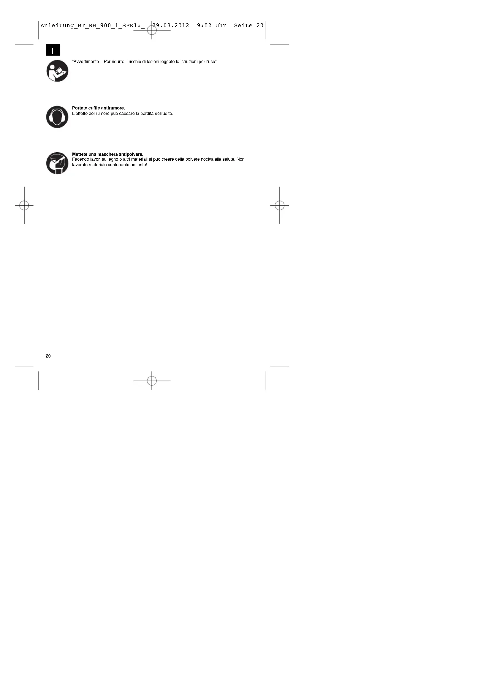 “Avvertimento – Per ridurre il rischio di lesioni leggete le istruzioni per l’uso” Portate cuffie antirumore. L’effetto del rumore può causare la perdita dell’udito. Mettete una maschera antipolvere. Facendo lavori su legno o altri materiali si può creare della polvere nociva alla salute. Non lavorate materiale contenente amianto! Anleitung_BT_RH_900_1_SPK1:_ 29.03.2012 9:02 Uhr Seite 20 Attenzione! Nell’usare gli apparecchi si devono rispettare diverse avvertenze di sicurezza per evitare lesioni e danni. Quindi leggete attentamente queste istruzioni per l’uso. Conservatele bene per avere a disposizione le informazioni in qualsiasi momento. Se date l’apparecchio ad altre persone consegnate loro queste istruzioni per l’uso insieme all’apparecchio! Non ci assumiamo alcuna responsabilità per incidenti o danni causati dal mancato rispetto di queste istruzioni e delle avvertenze di sicurezza.