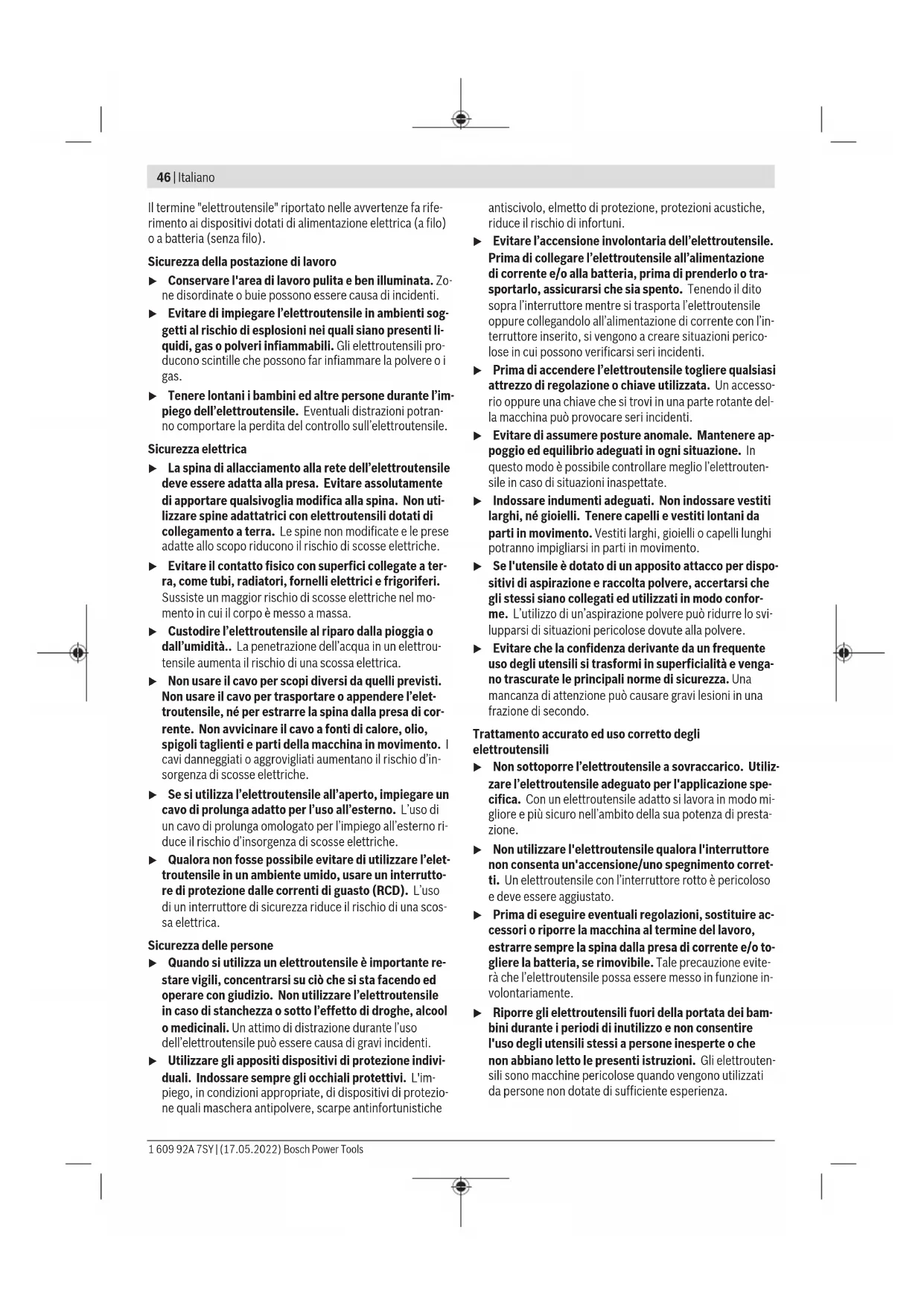 1,5 1,5 1,5 Il livello di vibrazione ed il valore di emissione acustica indi- cati nelle presenti istruzioni sono stati rilevati conformemen- te ad una procedura di misurazione unificata e sono utilizza- bili per confrontare gli elettroutensili. Le stesse procedure sono idonee anche per una valutazione temporanea del livel- lo di vibrazione e dell’emissione acustica. Il livello di vibrazione ed il valore di emissione acustica sono riferiti agli impieghi principali dell’elettroutensile; qualora, tuttavia, l’elettroutensile venisse utilizzato per altre applica- zioni, oppure con accessori differenti o in caso di insufficien- te manutenzione, il livello di vibrazione ed il valore di emis- sione acustica potrebbero variare. Ciò potrebbe aumentare sensibilmente l’emissione di vibrazioni e l’emissione acustica sull’intero periodo di funzionamento. Per valutare con precisione i valori di vibrazione e di emissio- ne acustica, andranno considerati anche i periodi nei quali l’utensile sia spento, oppure acceso, ma non utilizzato. Ciò potrebbe ridurre sensibilmente l’emissione di vibrazioni e l’emissione acustica sull’intero periodo di funzionamento. Adottare misure di sicurezza supplementari per proteggere l’operatore dall’effetto delle vibrazioni: ad esempio, sottopo- nendo a manutenzione l’elettroutensile e gli utensili accesso- ri, mantenendo calde le mani e organizzando i vari processi di lavoro. Montaggio u Utilizzare esclusivamente lame la cui velocità massi- ma ammessa sia maggiore di quella del funzionamento a vuoto dell’elettroutensile in dotazione. Inserimento/sostituzione della lama circolare u Prima di qualunque intervento sull’elettroutensile estrarre la spina di rete dalla presa. u Durante il montaggio della lama, indossare guanti pro- tettivi. Toccando la lama vi è il pericolo di incidenti. u Non utilizzare in nessun caso mole abrasive come utensile accessorio. u Utilizzare esclusivamente lame che corrispondano ai dati caratteristici indicati nelle presenti istruzioni d’uso e riportati sull’elettroutensile, omologate secon- do la norma EN847-1 e munite della rispettivo con- trassegno. Selezione della lama Una panoramica dei tipi di lame consigliati è riportata all’ulti- ma pagina delle presenti istruzioni. Smontaggio della lama (vedere fig. A) Per eseguire la sostituzione degli utensili accessori, poggiare l’elettroutensile preferibilmente sul lato frontale della car- cassa del motore. – Premere il pulsante di bloccaggio dell’alberino (5) e te- nerlo premuto. u Premere il pulsante di bloccaggio dell’alberino (5) esclusivamente ad alberino della sega fermo. In caso contrario, l’elettroutensile potrebbe subire dei danni. – Utilizzando la chiave a brugola (4) svitare la vite di bloc- caggio (20) nel senso di rotazione ➊. – Ribaltare la cuffia di protezione oscillante (12) all’indietro e tenerla ferma. – Rimuovere la flangia di serraggio (21) e la lama (22) dall’alberino della sega (24). Montaggio della lama (vedere fig. A) Per eseguire la sostituzione degli utensili accessori, poggiare l’elettroutensile preferibilmente sul lato frontale della car- cassa del motore. – Pulire la lama (22) e tutti gli elementi di serraggio da mon- tare. – Ribaltare la cuffia di protezione oscillante (12) all’indietro e tenerla ferma. – Applicare la lama (22) sulla flangia di montaggio (23). La direzione di taglio dei denti (direzione della freccia sulla lama) e la freccia del senso di rotazione sulla cuffia di pro- tezione (12) devono coincidere. 1 609 92A 7SY | (17.05.2022) Bosch Power ToolsItaliano | 51 – Applicare la flangia di serraggio (21) e avvitare la vite di serraggio (20) nel senso di rotazione ➋. Prestare atten- zione alla corretta posizione di montaggio della flangia di montaggio (23) e della flangia di serraggio (21). – Premere il pulsante di bloccaggio dell’alberino (5) e te- nerlo premuto. – Utilizzando la chiave a brugola (4), fissare la vite di bloc- caggio (20) nel senso di rotazione ➋. La coppia di serrag- gio dovrà essere di 6–9Nm, corrispondenti al serraggio manuale più ¼ di giro. Aspirazione polvere/aspirazione trucioli Polveri e materiali come vernici contenenti piombo, alcuni ti- pi di legname, minerali e metalli possono essere dannosi per la salute. Il contatto oppure l’inalazione delle polveri possono causare reazioni allergiche e/o malattie delle vie respiratorie dell’operatore oppure delle persone che si trovano nelle vici- nanze. Determinate polveri come polvere da legname di faggio o di quercia sono considerate cancerogene, in modo particolare insieme ad additivi per il trattamento del legname (cromato, protezione per legno). Materiale contenente amianto deve essere lavorato esclusivamente da personale specializzato. – Utilizzare possibilmente un’aspirazione polvere adatta per il materiale. – Provvedere ad una buona aerazione del posto di lavoro. – Si consiglia di portare una mascherina protettiva con clas- se di filtraggio P2. Osservare le norme in vigore nel vostro Paese per i materiali da lavorare. u Evitare accumuli di polvere nella postazione di lavoro. Le polveri si possono incendiare facilmente. Montaggio dell’adattatore di aspirazione (vedere fig. B) Inserire l’adattatore di aspirazione (26) sull’espulsione tru- cioli (16) facendolo scattare in posizione. Fissare l’adattato- re di aspirazione (26) anche con la vite (25). All’adattatore di aspirazione (26) si può collegare un tubo di aspirazione da 35 mm di diametro. u L’adattatore di aspirazione non può essere montato senza sistema di aspirazione esterno collegato. In caso contrario vi è il pericolo di intasare il canale di aspirazio- ne. u All’adattatore di aspirazione non può essere collegato alcun sacchetto raccoglipolvere. In caso contrario il si- stema di aspirazione può intasarsi. Per garantire un’aspirazione ottimale della polvere, l’adatta- tore di aspirazione (26) deve essere pulito reg