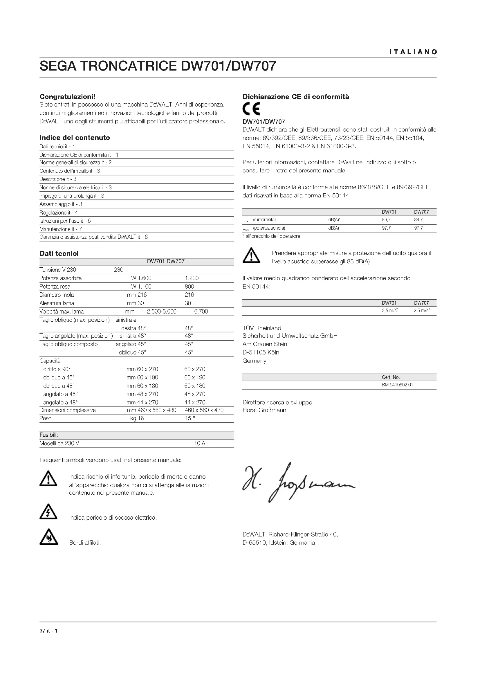 2.500-5.000 6.700 Taglio obliquo (max. posizioni) sinistra e destra 48° 48° Taglio angolato (max. posizioni) sinistra 48° 48° Taglio obliquo composto angolato 45° 45° obliquo 45° 45° Capacità diritto a 90° mm 60 x 270 60 x 270 obliquo a 45° mm 60 x 190 60 x 190 obliquo a 48° mm 60 x 180 60 x 180 angolato a 45° mm 48 x 270 48 x 270 angolato a 48° mm 44 x 270 44 x 270 Dimensioni complessive mm 460 x 560 x 430 460 x 560 x 430 Peso kg 16 15,5 Fusibili: Modelli da 230 V 10 A I seguenti simboli vengono usati nel presente manuale: Indica rischio di infortunio, pericolo di morte o danno all’apparecchio qualora non ci si attenga alle istruzioni contenute nel presente manuale. Indica pericolo di scossa elettrica. Bordi affilati. Dichiarazione CE di conformità DW701/DW707