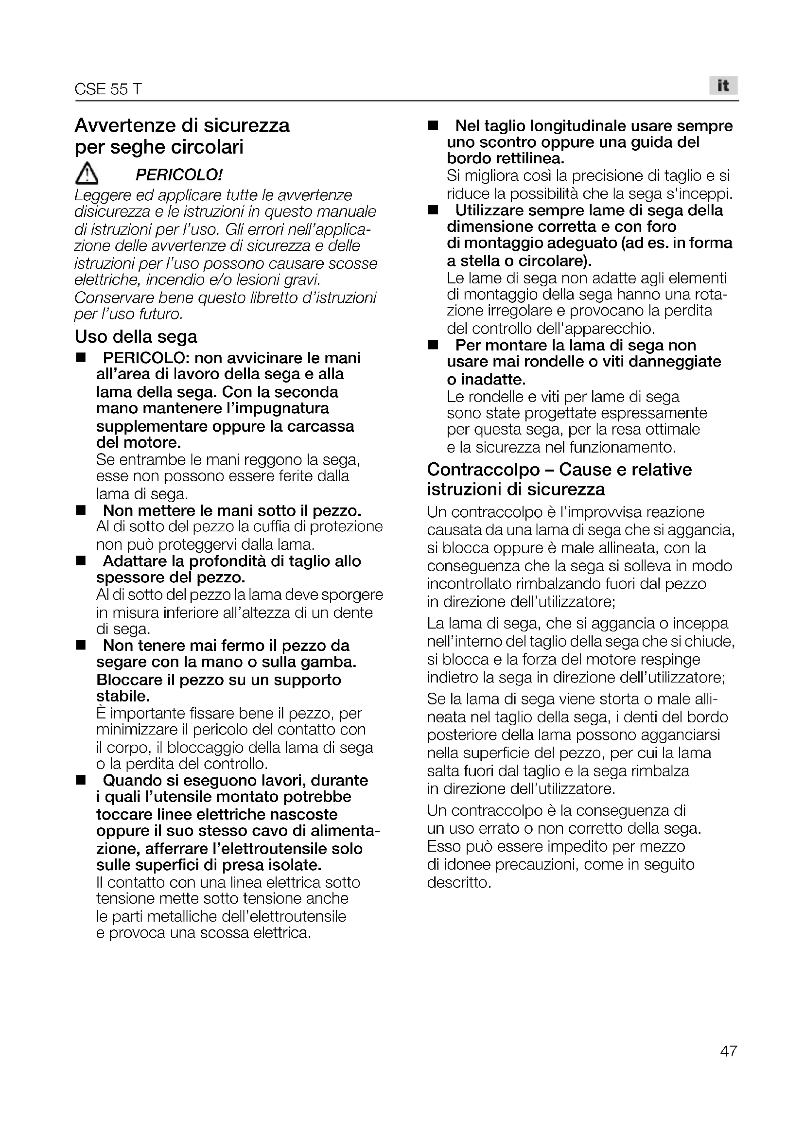 Avvertenze di sicurezza per seghe circolari mbof`lil> iÉÖÖÉêÉ=ÉÇ=~ééäáÅ~êÉ=íìííÉ=äÉ=~îîÉêíÉåòÉ= Çá ëáÅìêÉòò~=É=äÉ=áëíêìòáçåá=áå=èìÉëíç=ã~åì~äÉ= Çá=áëíêìòáçåá=éÉê=äÛìëçK=däá=Éêêçêá=åÉääÛ~ééäáÅ~J òáçåÉ=ÇÉääÉ=~îîÉêíÉåòÉ=Çá=ëáÅìêÉòò~=É=ÇÉääÉ= áëíêìòáçåá=éÉê=äÛìëç=éçëëçåç=Å~ìë~êÉ=ëÅçëëÉ= ÉäÉííêáÅÜÉI=áåÅÉåÇáç=ÉLç=äÉëáçåá=Öê~îáK= `çåëÉêî~êÉ=ÄÉåÉ=èìÉëíç=äáÄêÉííç=ÇÛáëíêìòáçåá= éÉê=äÛìëç=ÑìíìêçK Uso della sega PERICOLO: non avvicinare le mani all’area di lavoro della sega e alla lama della sega. Con la seconda mano mantenere l’impugnatura supplementare oppure la carcassa del motore. Se entrambe le mani reggono la sega, esse non possono essere ferite dalla lama di sega. Non mettere le mani sotto il pezzo. Al di sotto del pezzo la cuffia di protezione non può proteggervi dalla lama. Adattare la profondità di taglio allo spessore del pezzo. Al di sotto del pezzo la lama deve sporgere in misura inferiore all’altezza di un dente di sega. Non tenere mai fermo il pezzo da segare con la mano o sulla gamba. Bloccare il pezzo su un supporto stabile. È importante fissare bene il pezzo, per minimizzare il pericolo del contatto con il corpo, il bloccaggio della lama di sega o la perdita del controllo. Quando si eseguono lavori, durante i quali l’utensile montato potrebbe toccare linee elettriche nascoste oppure il suo stesso cavo di alimenta- zione, afferrare l’elettroutensile solo sulle superfici di presa isolate. Il contatto con una linea elettrica sotto tensione mette sotto tensione anche le parti metalliche dell’elettroutensile e provoca una scossa elettrica. Nel taglio longitudinale usare sempre uno scontro oppure una guida del bordo rettilinea. Si migliora così la precisione di taglio e si riduce la possibilità che la sega s'inceppi. Utilizzare sempre lame di sega della dimensione corretta e con foro di montaggio adeguato (ad es. in forma a stella o circolare). Le lame di sega non adatte agli elementi di montaggio della sega hanno una rota- zione irregolare e provocano la perdita del controllo dell'apparecchio. Per montare la lama di sega non usare mai rondelle o viti danneggiate o inadatte. Le rondelle e viti per lame di sega sono state progettate espressamente per questa sega, per la resa ottimale e la sicurezza nel funzionamento. Contraccolpo – Cause e relative istruzioni di sicurezza Un contraccolpo è l’improvvisa reazione causata da una lama di sega che si aggancia, si blocca oppure è male allineata, con la conseguenza che la sega si solleva in modo incontrollato rimbalzando fuori dal pezzo in direzione dell’utilizzatore; La lama di sega, che si aggancia o inceppa nell’interno del taglio della sega che si chiude, si blocca e la forza del motore respinge indietro la sega in direzione dell’utilizzatore; Se la lama di sega viene storta o male alli- neata nel taglio della sega, i denti del bordo posteriore della lama possono agganciarsi nella superficie del pezzo, per cui la lama salta fuori dal taglio e la sega rimbalza in direzione dell’utilizzatore. Un contraccolpo è la conseguenza di un uso errato o non corretto della sega. Esso può essere impedito per mezzo di idonee precauzioni, come in seguito descritto.CSE 55 T